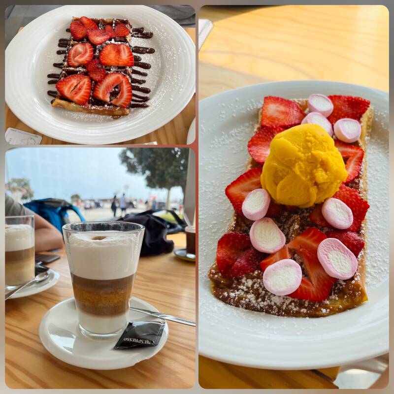 Der Hunger zieht uns ans Meer. Wir landen im Cremosi, einem Café mit leckeren Waffeln und Crêpes. Und dann chillen wir am Beach. Kira wagt sich sogar in die Wellen.