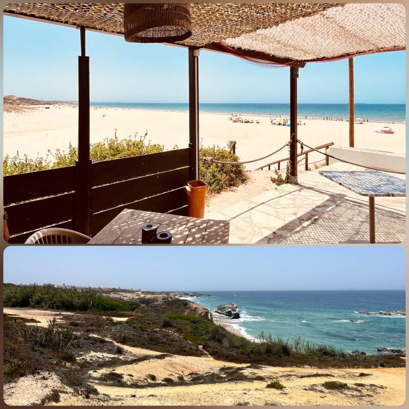 Wir verlassen Cascais kurz vor 10 Uhr und fahren über Lissabon in Richtung Süden. 220 km liegen vor uns. Die Straßen sind recht frei. Sogar die Brücke des 25. April in Lissabon passieren wir ohne Stau. So erreichen wir mittags Sines, welches bekannt ist für seine Ölraffinerie. Der berühmteste Sohn der Stadt ist der Seefahrer Vasco da Gama, der den Seeweg nach Indien fand. Wir kaufen ein paar Lebensmittel und Getränke ein und machen uns auf zum Strand. Am Praia de Sao Torpes erwarten uns endlich warme Temperaturen. Die Sonne lacht und auch der Wind scheint heute eine Pause einzulegen. Wir gönnen uns einen leckeren Cappuccino. Ab jetzt brauchen wir tatsächlich einen Sonnenschirm. Den müssen wir später im nächsten Supermarkt noch kaufen.