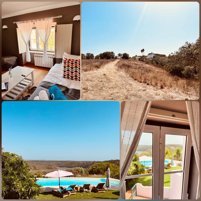 Nach weiteren 30 Minuten biegt das Navi links ab. Ab jetzt gibt es nur noch Schotterwege bis zur nächsten Unterkunft. Äste liegen auf dem Weg, aber Kira räumt diese fleißig zur Seite. Schließlich landen wir irgendwo hinter Vila Nova de Milfontes im Landesinneren, dafür mit traumhaften Blick über den Fluss Mira.