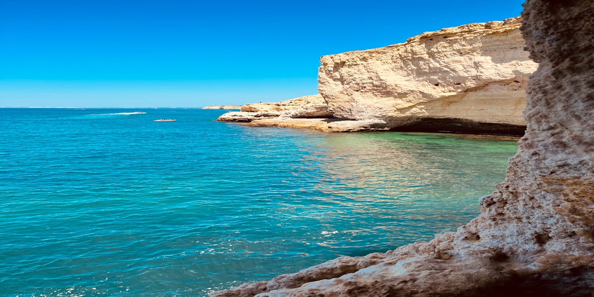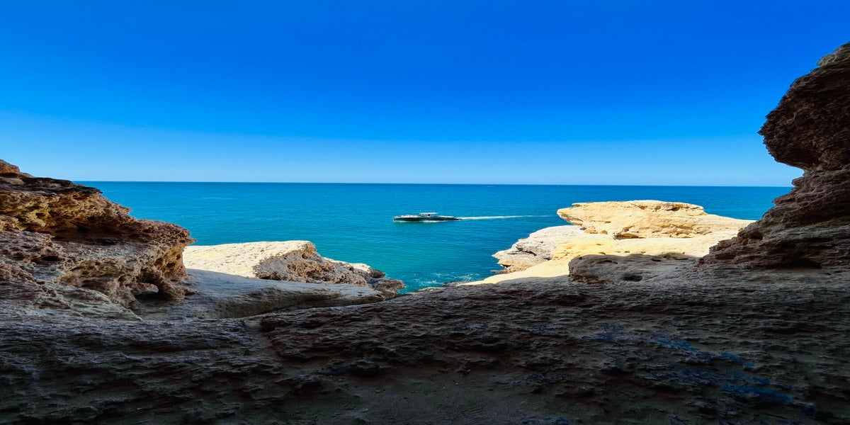 Am Ende des Steges sammeln sich wieder die Menschen. Hier muss das Algar Seco Fenster sein. Keine Ahnung, warum genau das ein Instagram Hotspot ist. Wir haben andere, noch schönere Löcher gefunden. Aber es stehen nur 2 Familien an. So schauen wir uns diesen Hotspot an. Steigen einmal hinab und dann wieder hinauf. Weiter gehts. Der Weg wird urbaner (zu Marios Freude) und es sind nur noch wenige Menschen zu sehen. Der Ausblick ist wirklich traumhaft. Auf dem Meer ist ordentlich viel Bootsverkehr zu erkennen. Alle mit dem Ziel: Benagil-Höhle. Bei uns bahnt sich der nächste Abstieg an, um zur nächsten Klippe zu kommen. Also wieder hinunter (an einem Hotelklotz vorbei) und auf der anderen Seite wieder hoch. Auch hier, wunderschöne Landschaft. Schließlich erreichen wir oben auf der Klippe einen Tisch mit 2 Stühlen. Wir können das Ziel, den Praia de Vale Centianes schon sehen. Unten am Strand nach ca 4 km angekommen gönnen wir uns einen kleinen Mittagssnack. Leider müssen wir hier die Wandertour beenden, da wir zurück zum Auto müssen. Für 15 Uhr ist die Speedboot-Tour gebucht. So laufen wir an der Straße entlang den kürzesten Weg zurück.