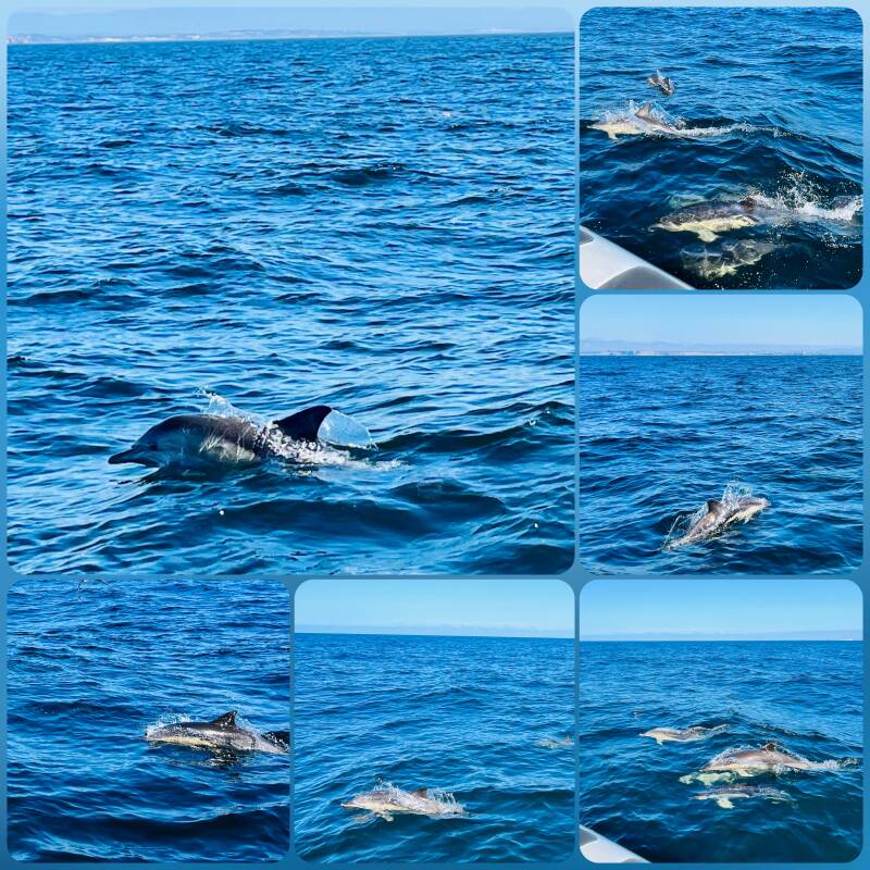 Es dauert nicht lange und wir werden von einer Delfin-Familie begleitet. Mal sind sie weiter weg und manchmal schwimmen sie mit uns mit oder tauchen unter uns durch. Sie sind wahnsinnig schnell. Ein tolles Erlebnis, was viel zu früh vorbei ist.