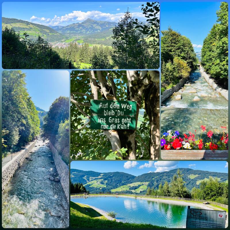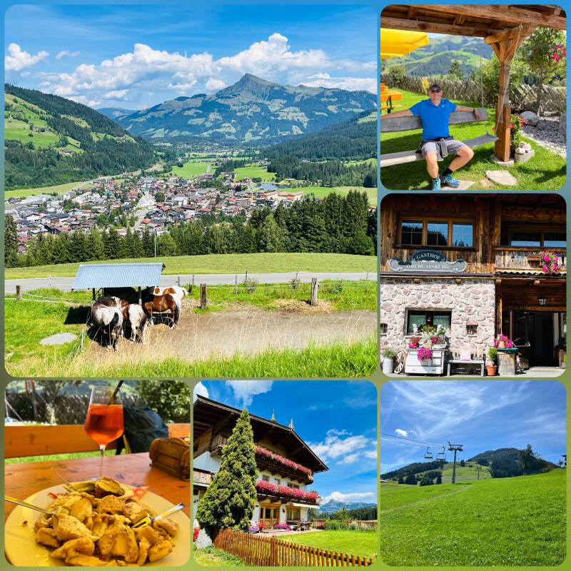 Gestärkt ziehen wir weiter in Richtung Dorf. Vorbei am Badesee erreichen wir die Talstation der Gaisbergbahn. Im Hintergrund ist das Kitzbühler Horn zu sehen. Der Lift ist wieder verführerisch, aber nein, heute gibts keine Unterstützung. Den Obergaisberg Gasthof schaffen wir auch so. Knappe 200 Höhenmeter liegen nun vor uns. Auch hier gehts ganz offiziell erstmal steil über den Hang auf der Wiese nach oben, bis der Weg schließlich auf der Straße weiterführt. Uns kommen aber kaum Autos entgegen. Das passt also. Im Rücken ist weiterhin das Kitzbühler Horn zu sehen. Nach 45 Minuten kommen wir an und gönnen uns einen leckeren Kaiserschmarrn mit Zwetschenröster. So sitzen wir (viel zu lange) und genießen den Blick. Irgendwann machen wir uns auf den Rückweg. Die Knochen sind nun zu spüren. Es geht noch zu einem kleinen See nach oben, bevor wir zurück ins Tal wandern. Wir nehmen dann noch einen kurzen Umweg über den Dorfplatz, wo gerade ein Fest mit Musik eröffnet wird. Wir machen trotzdem keinen Halt und gehen so direkt weiter bis zum Hotel. Nach 5 1/2 h reiner Gehzeit, 15,6 km und über 600 Höhenmetern sind wir wieder zurück. Wir freuen uns auf die Sauna :-).