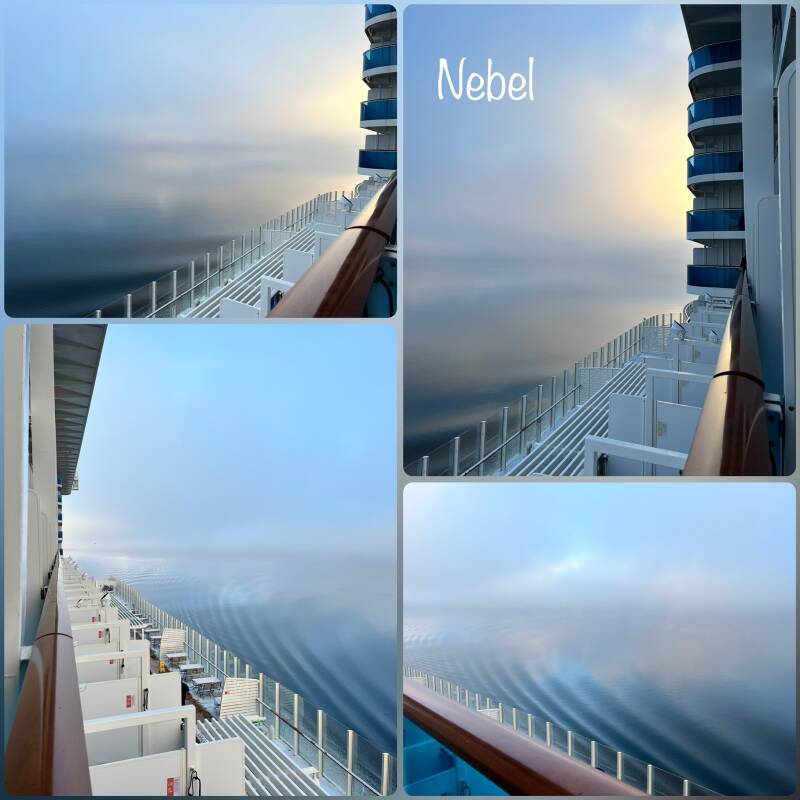 Doch plötzlich liegt eine Nebelfront direkt vor uns. Von jetzt auf sofort sieht man gar nichts mehr. Kein Land, kein Himmel, kein Wasser, einfach nichts. Der Kapitän lässt das Horn immer wieder ertönen. Wir ziehen uns auf Kabine zurück und hoffen darauf, dass sich ab und zu eine Lücke aufmacht. Das passiert dann auch ab und an und so stehen wir mit dicker Mütze und Winterjacke immer wieder auf dem Balkon, auch wenn die Sicht nicht wirklich optimal ist.