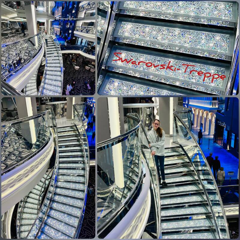 Nachdem auch Koffer Nummer 2 den Weg auf unsere Kabine gefunden hat, machten wir uns auf Erkundungstour. Wir arbeiten Deck für Deck ab. Die Outdoor-Pools und der Wasserpark haben geöffnet. Und tatsächlich nutzen Gäste diese Bereiche bei Regen und 8 Grad. Es gibt im Innenbereichen einen riesigen Unterhaltungsbereich. Sporthalle, Bowlingbahn, Kino, Casino, Spielautomaten und Fahrsimulatoren warten aufs Ausprobieren. Hier kann man gut Geld loswerden. Ein Kletterpark umrundet den Wasserpark. Diese ist jedoch aufgrund des Wetters geschlossen.