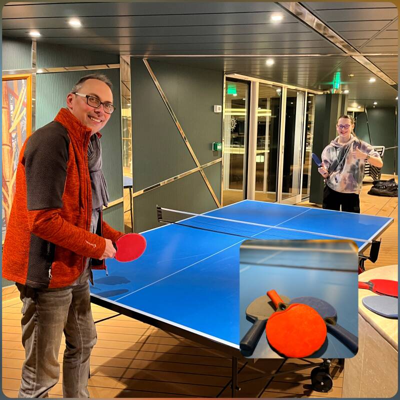 Der Abend klingt ruhig aus. Nach dem Essen erhaschen wir einen Tischtennistisch. Ganz knapp gewinnt Mario das Match.