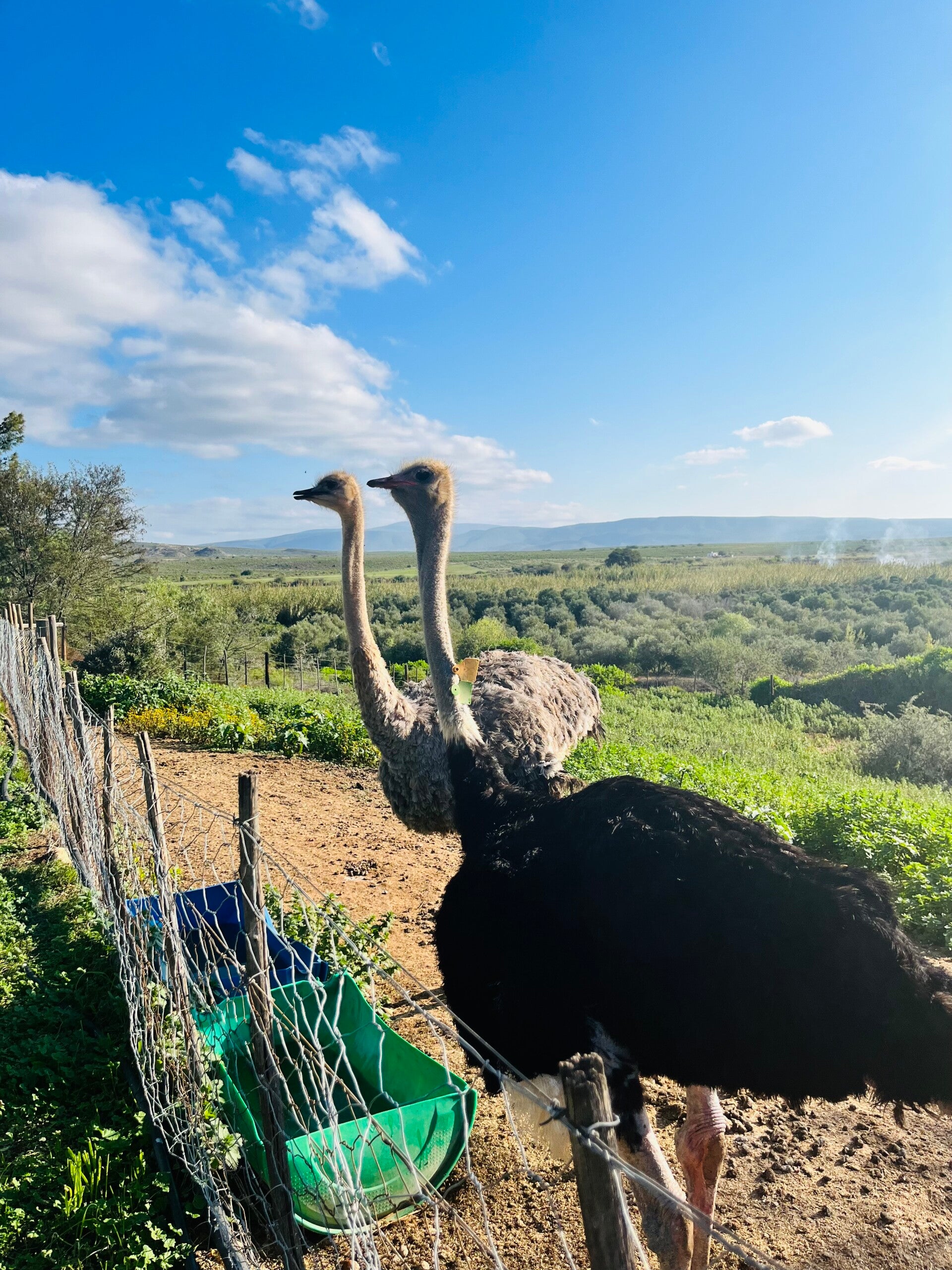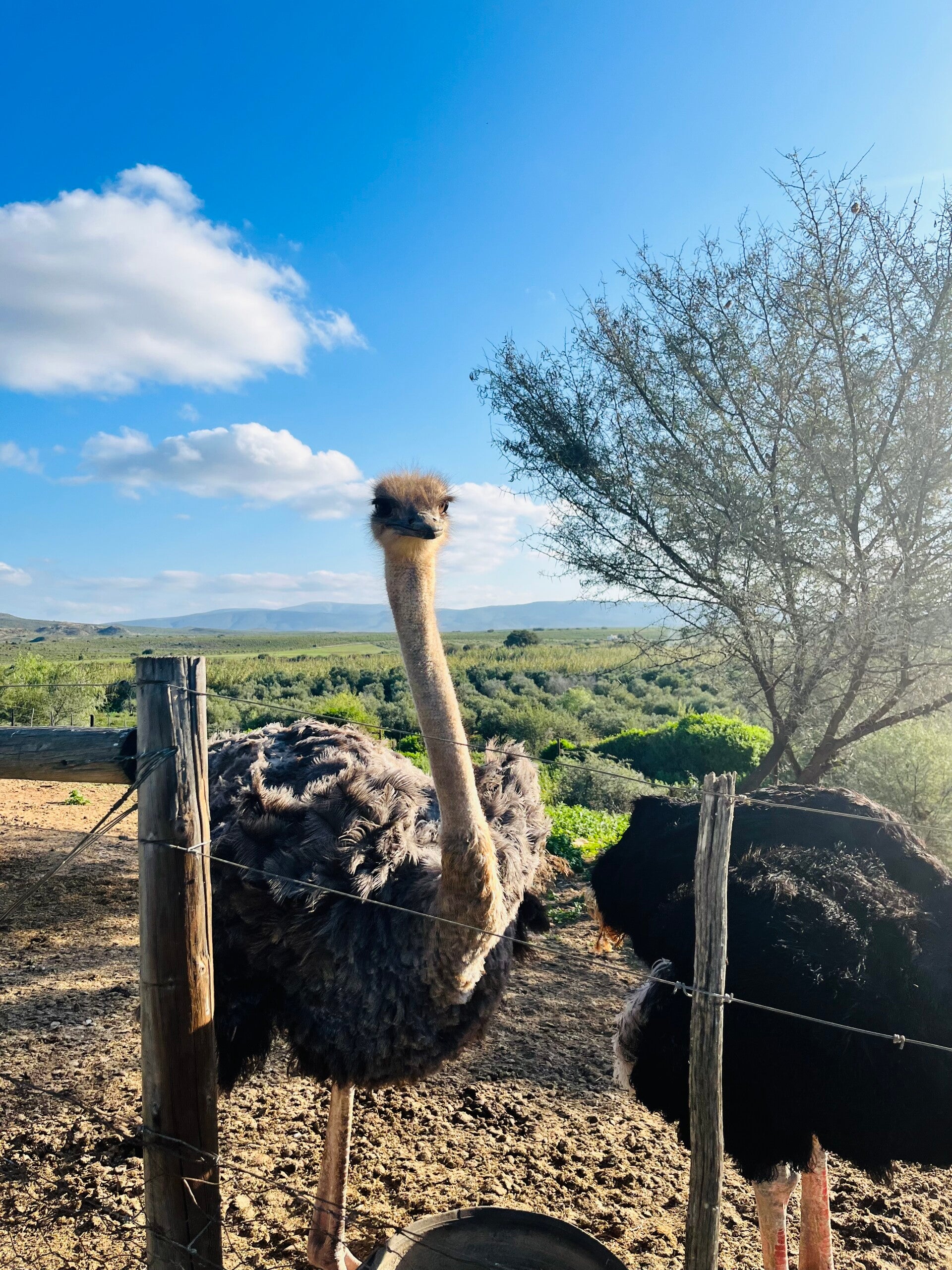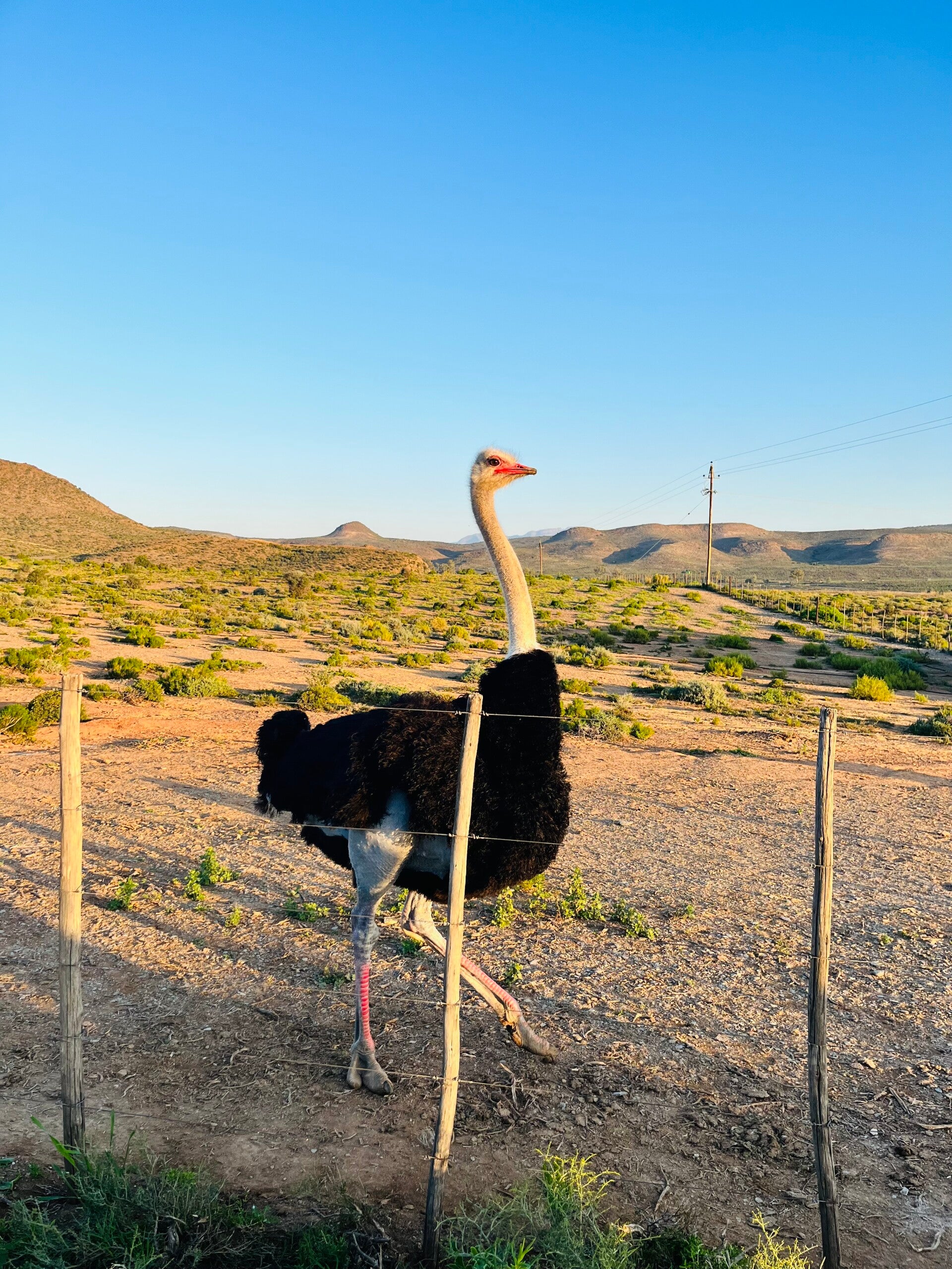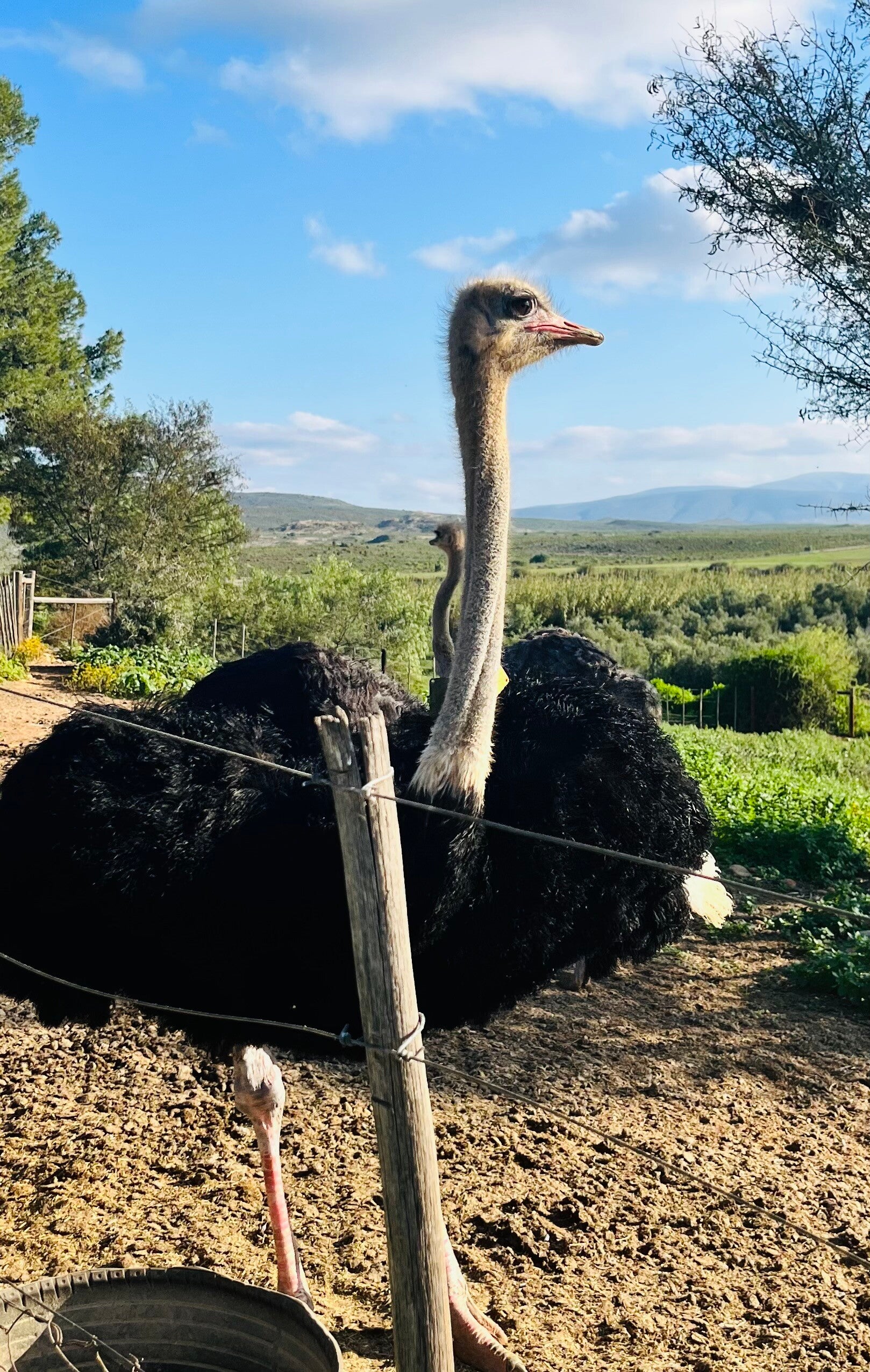 Kurz vor Oudtshoorn biegen wir ab und die ersten Straußenfarmen sind zu sehen. Nochmals abgebogen landen wir auf einem Feldweg. Nach einem knappen Kilometer ist ein kleines Paradies erreicht, die Straußenfarm De Denne, was gleichzeitig unsere Unterkunft der nächsten 2 Tage ist. Es sind nur Angestellte (Gärtner) zu sehen. Keine Gäste. Es stellt sich später auch heraus, dass wir heute die einzigsten Urlauber hier sind. Wir werden herzlich empfangen und nehmen zwei tolle Zimmer in Empfang. Die Tischlers bekommen sogar ein Zimmer mit Verbindungstür, so dass Kira eine ganze Suite samt Kingsizebett, Sofa, TV und einem eigenen Badezimmer bezieht. Der Ausblick könnte romantischer nicht sein. Garten, Pool, Berge in der Ferne. Das Wetter hat komplett aufgezogen. Während der Fahrt war die Sonne noch nicht zu sehen, aber jetzt strahlt sie. Es sind nur 16 Grad und die Angestellten tragen Daunenjacke und Wollmütze. Uns reicht ein dünnes Strickjäckchen. Wir bekommen einen spontanen Lunch (Chicken Fingers + Chips). Dazu Wein und Bier. Besser gehts nicht. Nach einem Cappuccino schlendern wir über die Farm und machen Bekanntschaft mit 5 Straußen.