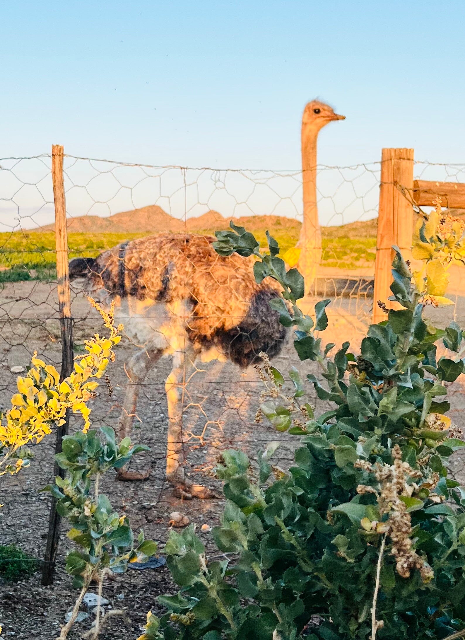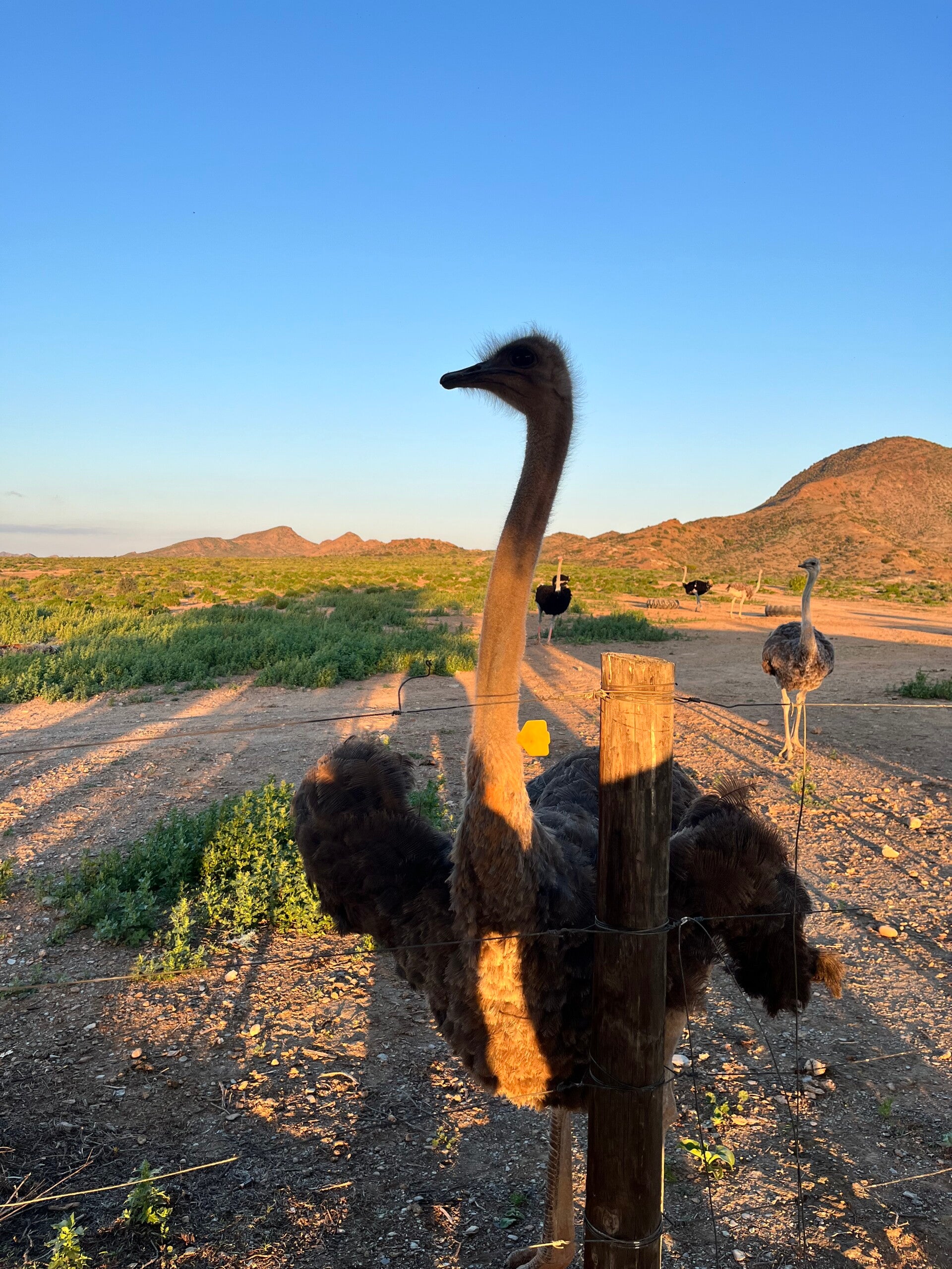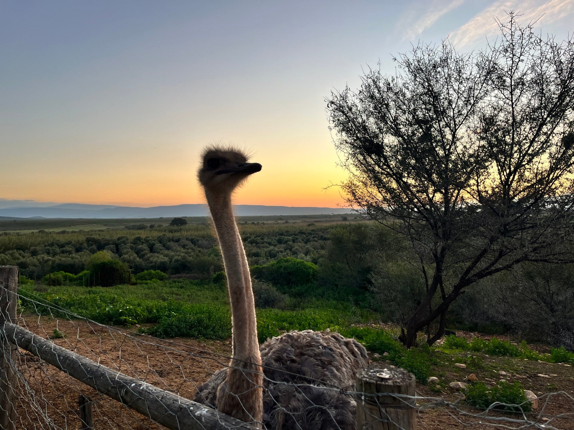 Später laufen wir in Richtung der unendlich weiten Außengehege und beobachten diese Tiere weiter. Jetzt rennen die sogar. Zwei Strauße streiten sich, es geht zur Sache. Die Sonne geht langsam unter (bereits kurz nach 17 Uhr). Jetzt wird’s wieder frisch, auch für uns. Die dicke Jacke muss wieder her. Zum Abendessen, natürlich bei Kaminfeuer, lassen wir uns das erste Straußensteak schmecken. Äußerlich wie Rind, ist es innen unfassbar zart. Ein tolles Geschmackserlebnis. Ein neuer Roséwein wird probiert. Auch der ist wieder lecker.
