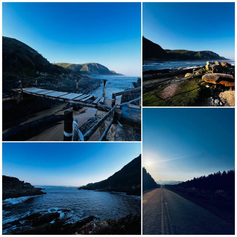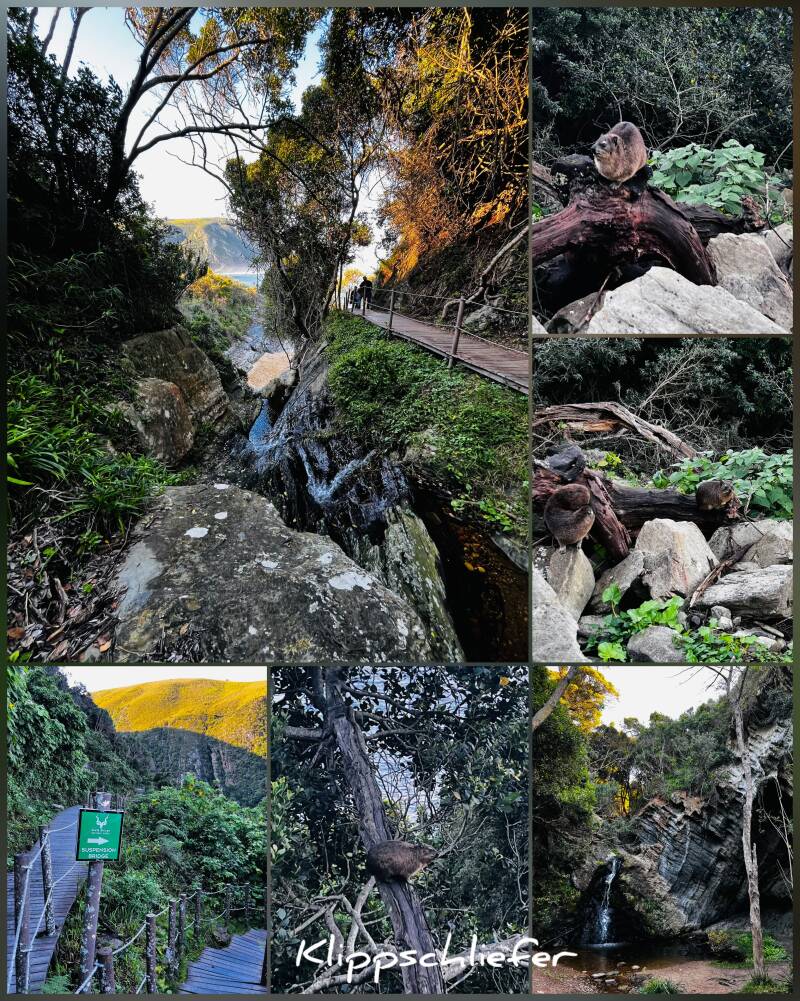 Es ist schon Nachmittag. Heute zeigt das Thermometer 26 Grad. So essen wir nur mit T-Shirt begleitet eine Kleinigkeit. Es folgt eine 30 minütige Wanderung über Stege zur Suspension Bridge. Hoch, runter, hoch, runter … . Es begegnen uns Asiaten und Araber. Also liegt ein Instagram Hotspot vor uns. Und so scheint es auch. Die eigentliche Natur, die Wellen, die Umgebung scheinen wenig interessant zu sein. Hauptsache das perfekte Bild für die nächste Story. Naja, die Menschenmassen scheinen heute schon durch zu sein. Das Licht ist auch nicht mehr perfekt fürs Foto. Die Brücke selbst ist ziemlich wacklig und wenig vertrauenswürdig. Sie bietet jedoch einen schönen Blick zur Flußmündung und ans Meer. Auf dem Rückweg zum Auto beobachten wir Klippschliefer, die den Murmeltieren ähneln. Kurz nach 16 Uhr treten wir im Sonnenuntergang die Rückreise nach Knysna an. 100 km liegen vor uns.