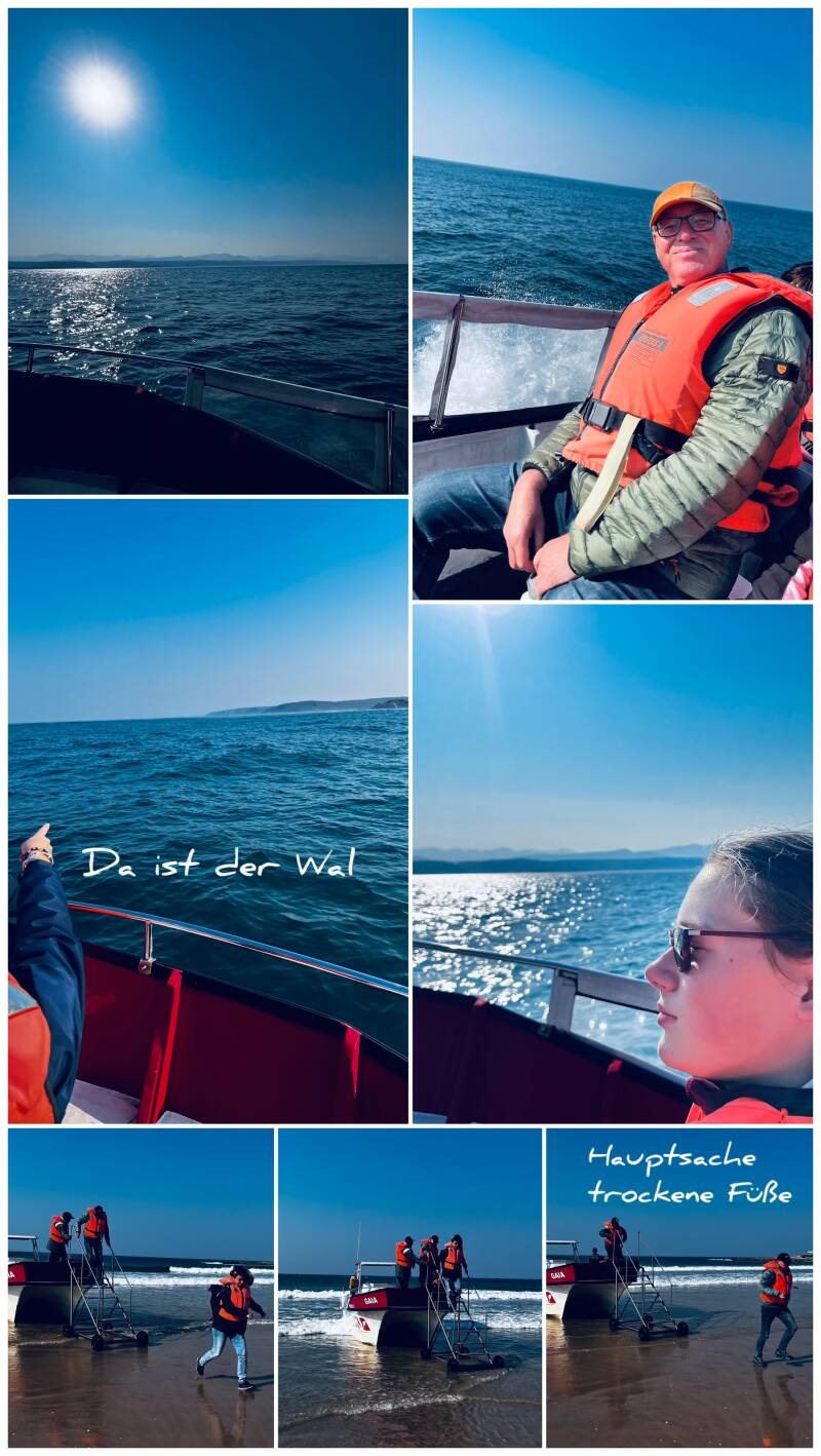 Es braucht eine ganze Weile, dann stoppt das Boot. In der Ferne ist ein riesiger Wal kurz zu sehen, dann ist er auch schon wieder weg. Etwas später pustet etwas aus dem Wasser. Noch ein Wal. Aber wirklich nah kommen sie uns nicht. Die Zeit vergeht und es geht im zügigen Tempo zurück an Land. Filmreif nimmt der Kapitän Anlauf und das Boot liegt im Sand. Über eine Leiter wird ausgestiegen. Ab und zu kommt eine Welle. So nehmen Mama und Mario die Füße in die Hand um trocken anzukommen.