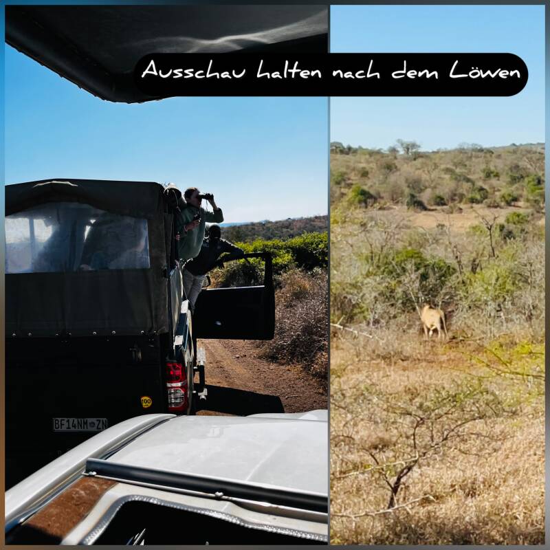 Und dann scheint unser Glückstag zu sein. Mario sichtet weit am Horizont einen weiblichen Löwen. Der verschwindet jedoch recht schnell. Ab jetzt gehts die Straße hoch und runter, hoch und runter. Und ganz plötzlich steht ein männlicher Löwe vor uns. Als wir beginnen zu filmen zeigt er uns sein Hinterteil und verschwindet im Gebüsch. Dort liegt er nun. Uns kommt ein Fahrzeug mit einem platten Reifen entgegen. Die Männer entscheiden sich für einen Radwechsel, keine 100 m vom Löwen entfernt. Wir keilen das Auto mit weiteren Fahrzeugen ein. Wir oben schieben Wache. In 15 Minuten ist alles erledigt und alle sitzen wieder im Wagen. Was für eine Aufregung.