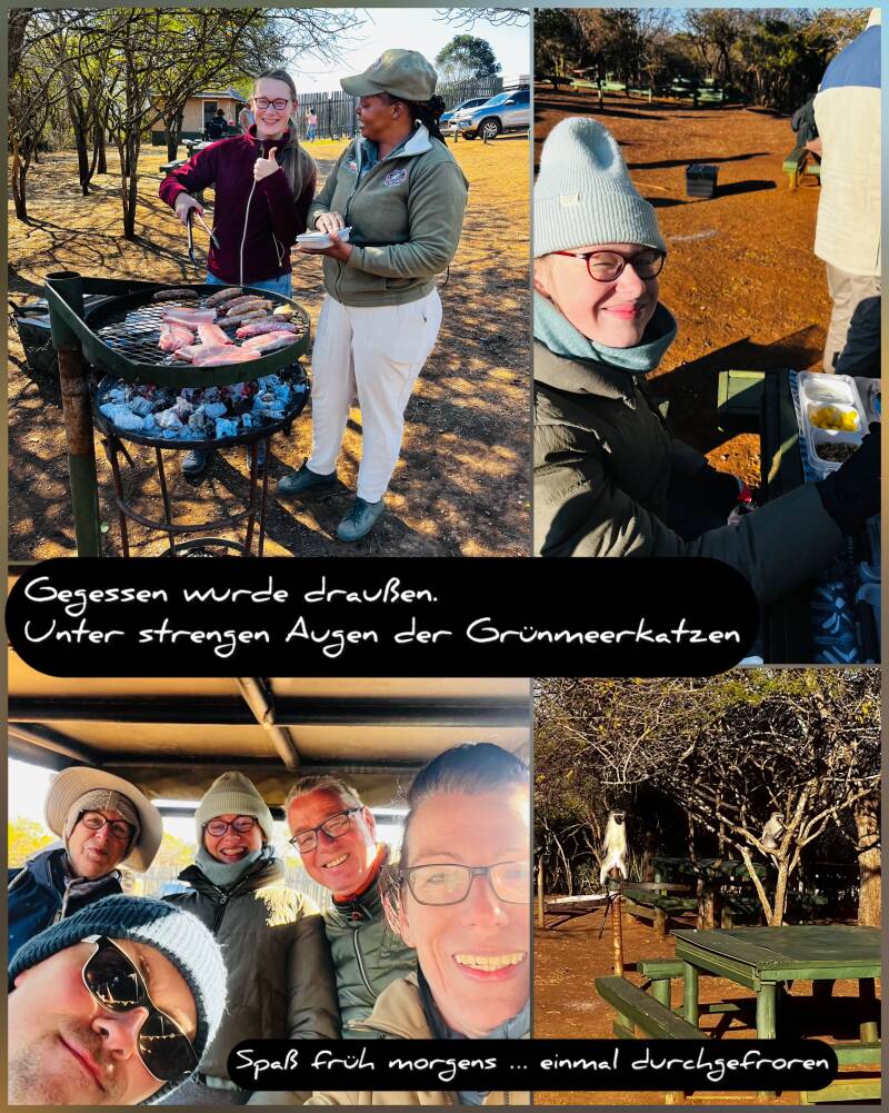 So langsam kommt bei uns der Hunger. Am Picknickplatz bei den Äffchen wird gegrillt. Leckeres Steak plus Bratwurst.