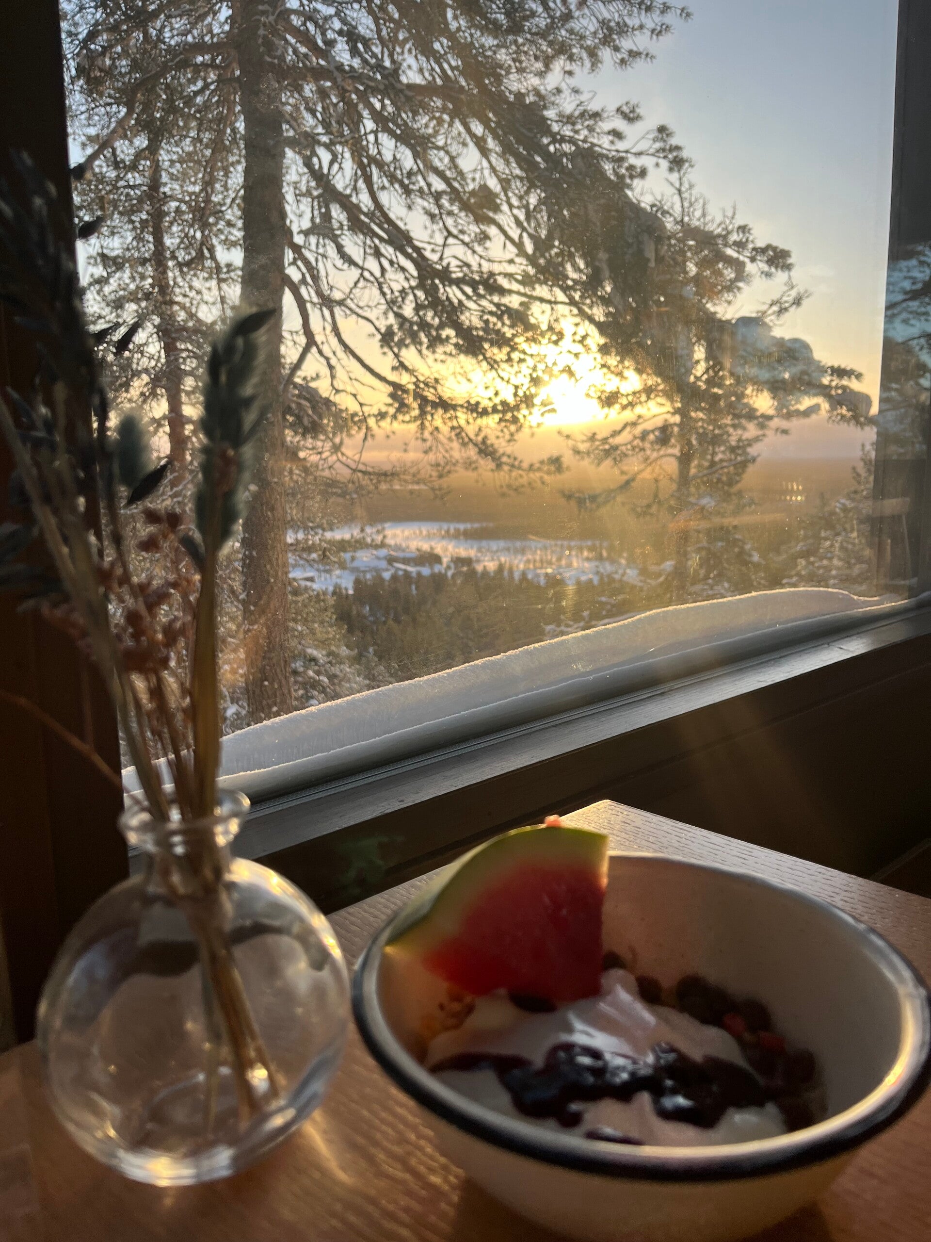 Der Tag verging wieder viel zu schnell. Trotzdem durfte ein Gang in die Sauna nicht fehlen. Zum Abschluss freuten wir uns heute über sautiertes Rentier und Schokokuchen plus Creme Brûlée zum Abendessen.