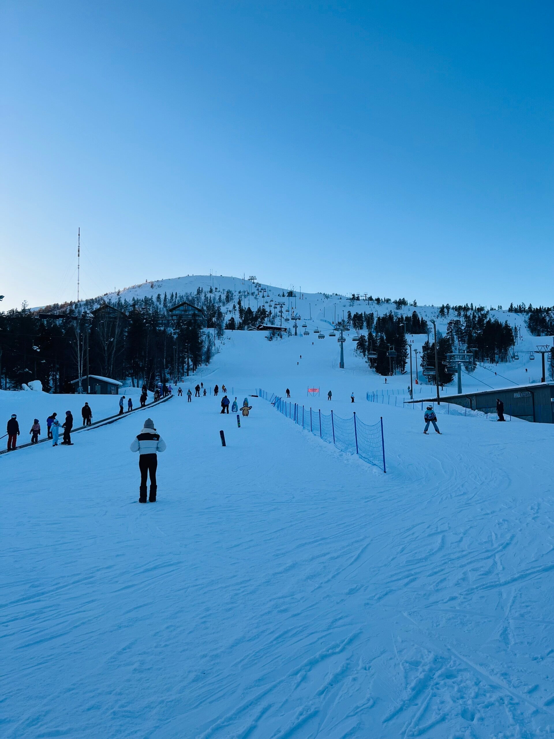 Am frühen Nachmittag kam die Familie im Appartement zu Kaffee und Kakao zusammen. Auch diese Pause hielt nicht lang. Der Wind hat nachgelassen und alle Lifte waren geöffnet. Da die Bahnen hier bis 18 Uhr fahren und wir alle die Skipässe dabei hatten, entschieden Mario und ich hoch auf den Berg zu fahren. Also erst knapp 20 min zu Fuß ins Tal und dann hoch auf den Berg. Ein herrlicher Sonnenuntergang erblickte unsere Augen. Der Wind zog hier oben dann doch ordentlich. Wir fanden wieder eine geschützte Kota, in der wir uns aufwärmen. Ein paar Kinder hielten ihre Marshmallows übers Feuer. So stellt man sich Finnland vor.