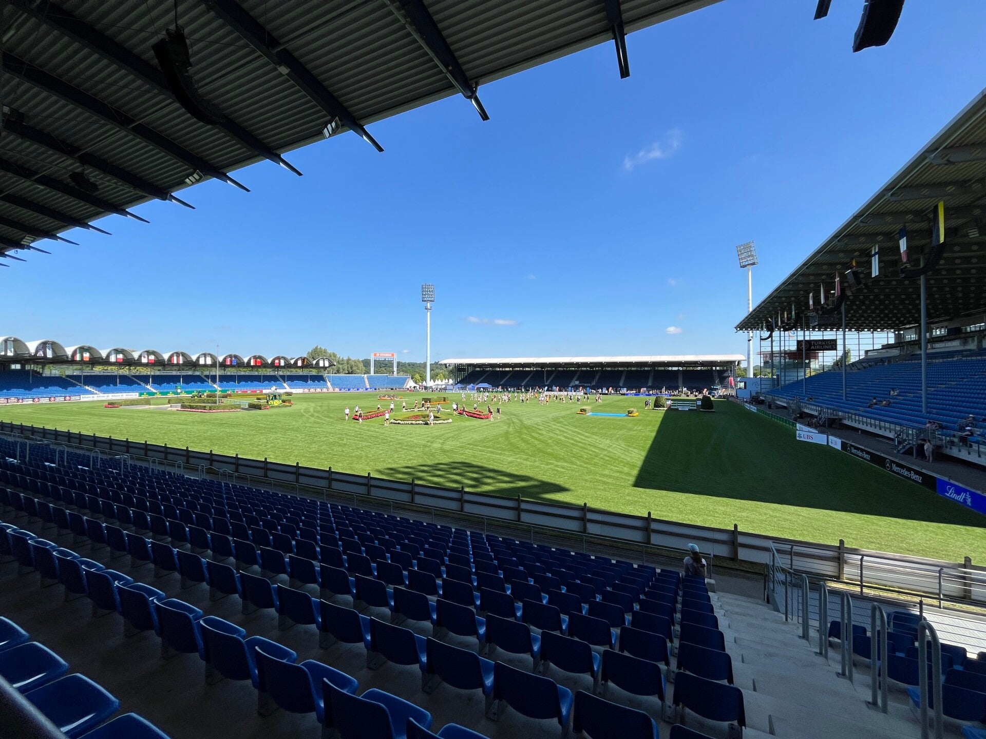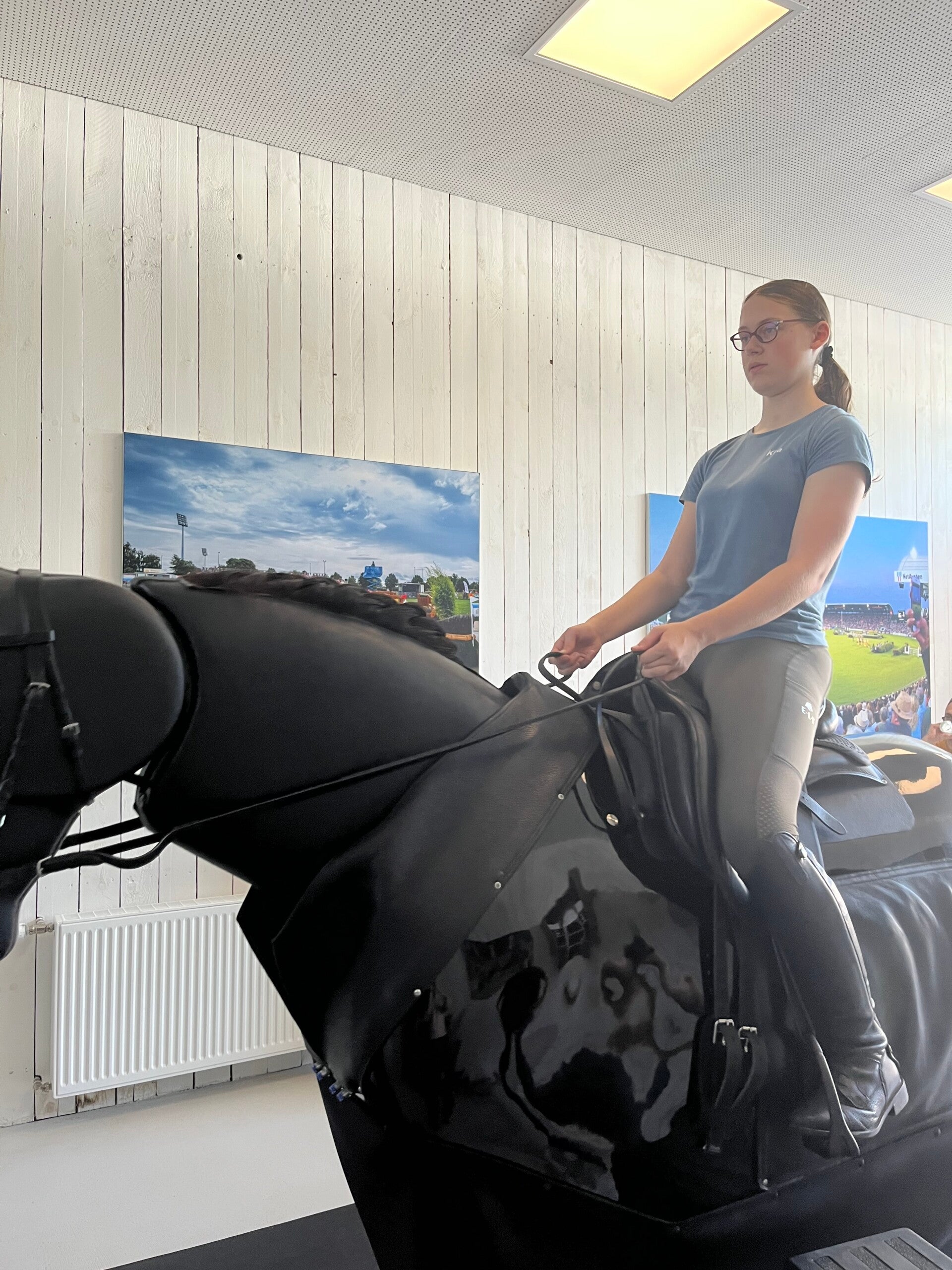 Am ersten Chio Sonntag findet parallel zu den Voltigier-Wettkämpfen der Soerser Familientag statt. Das komplette Gelände wird kostenfrei geöffnet. Es gibt Mitmachprogramme und für uns einen ersten Eindruck. Fast 300 Verkaufsstände zieren die Gassen. Wer hier nichts passendes findet, dem ist wohl auch nicht zu helfen. Wir suchen den Reitsport-Simulator vom Chio Campus auf, denn Kira hat ein Schnuppertraining vorab gebucht. Ich hatte keine genauen Vorstellungen, für was das genau gut sein soll. Aber man lässt sich ja gern überzeugen. Und siehe da, das ist was feines. Bekommt Kira doch schwarz auf weiß, dass sich ihr linkes Knie etwas ausruht. Für den Reitsport, wie auch für den Alltag, natürlich wenig sinnvoll, aber sie hatte sich nach dem Unfall unbewusst so eingerichtet. Daher wurde in dem Training direkt an diesem Problem gearbeitet.