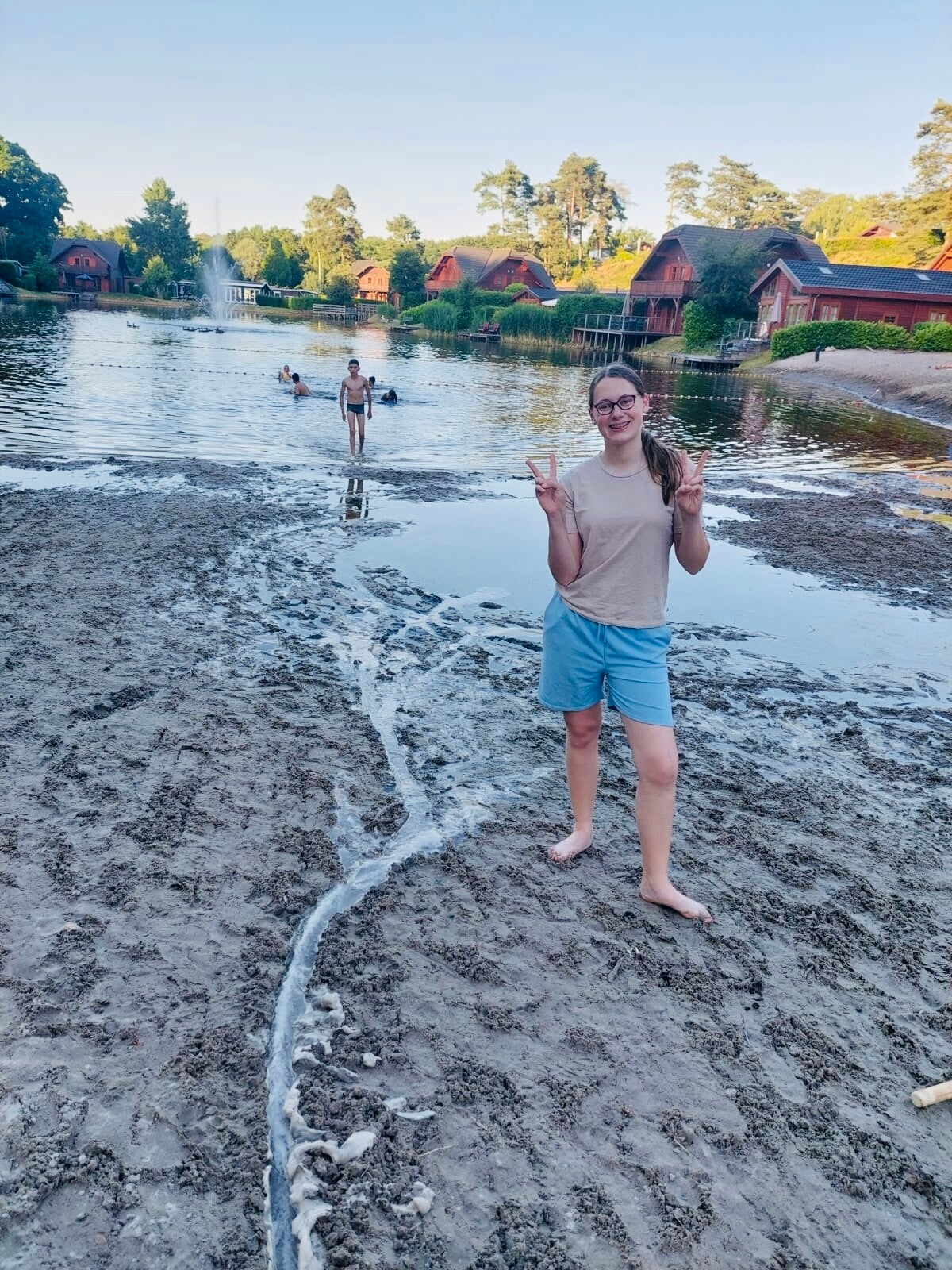 Mittags stärken wir uns bei einer Runde Nudeln und Pfannenkuchen (Eierkuchen), die bereits im Preis inkludiert sind. Am Nachmittag fahren wir zurück ins Ferienhaus und chillen, bevor wir zum Abendessen in den Ort hineinfahren. Den Abend beschließen wir am Strand. Kira und ich bauen einen Fluss zwischen Matschplatz und See … wie kleine Kinder :-).