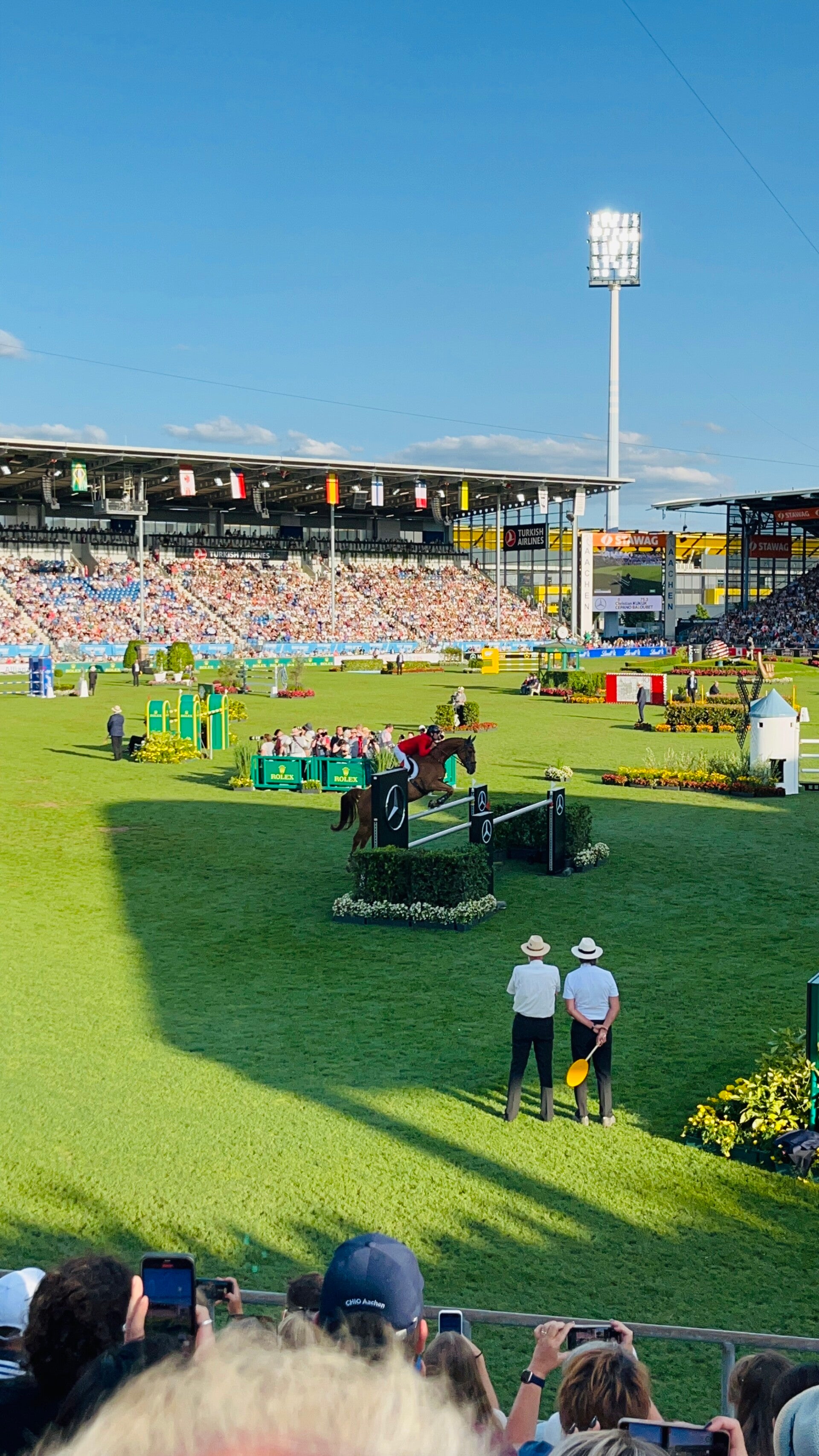 Dann ging es zum Essen und später nach einem kleinen unfreiwilligen Abstecher im Medical Center zum Nationenpreis ins Hauptstadion. Fast 40.000 Menschen jubeln den einzelnen Reitern zu. Deutschland landet auf Platz 4.