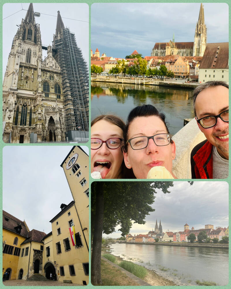 Wir verlassen unser Ferienhaus in Brunssum/ Niederlande in Richtung Österreich. Über 1.000 km liegen vor uns. Daher gibt’s einen Zwischenstopp in Regensburg. Die Fahrt läuft recht gut, nur an der niederländischen Grenze stehen wir kurz. So erreichen wir am frühen Abend Regensburg. Wir checken im Hotel ein und laufen die gut 2 km ins Zentrum, um etwas zu essen. Mit Blick auf den Dom gibt’s Schäufele und Schnitzel für uns. Als Dessert wartet ein leckeres Eis auf uns und so schlendern wir gemütlich zum Hotel zurück.