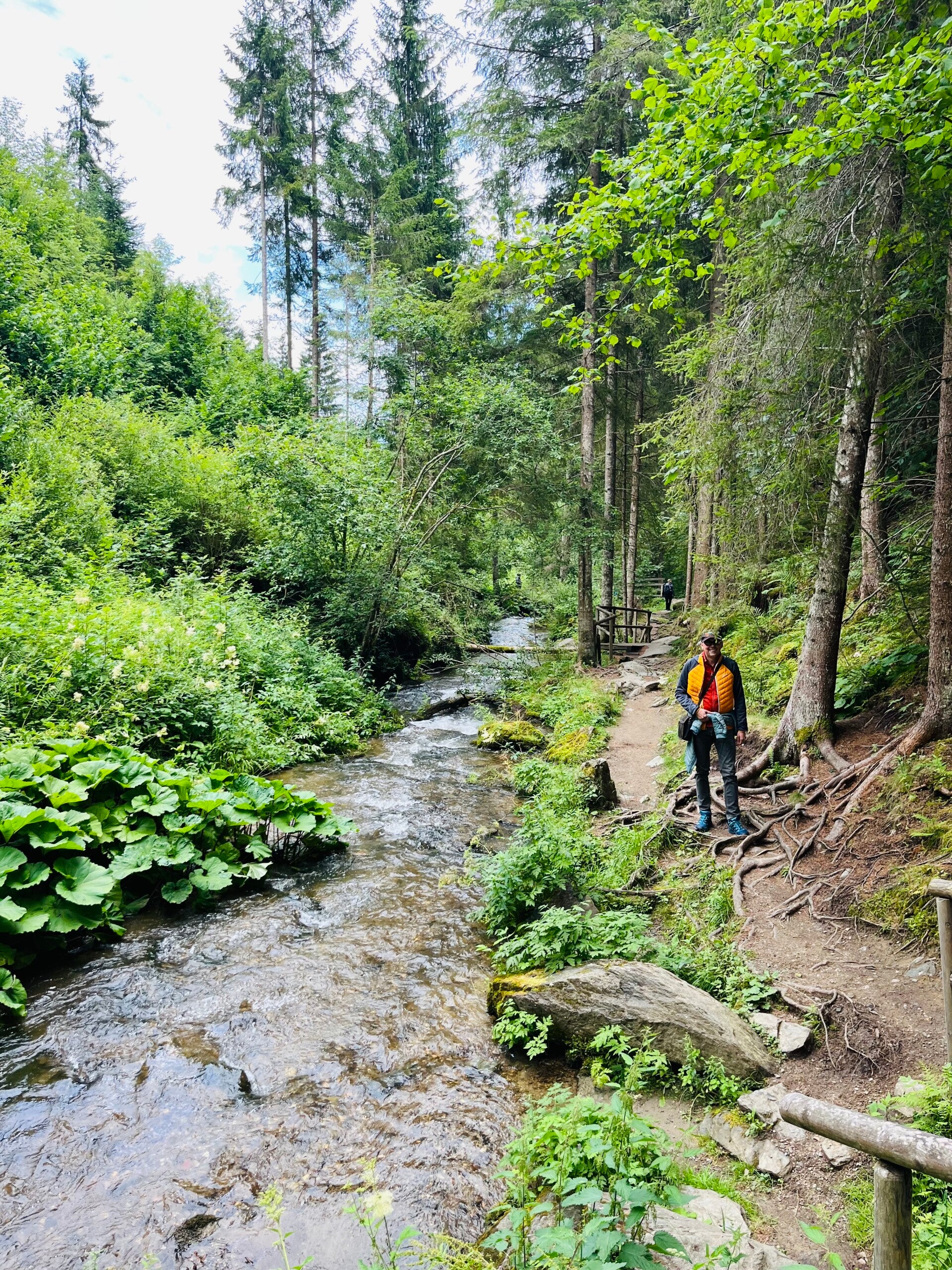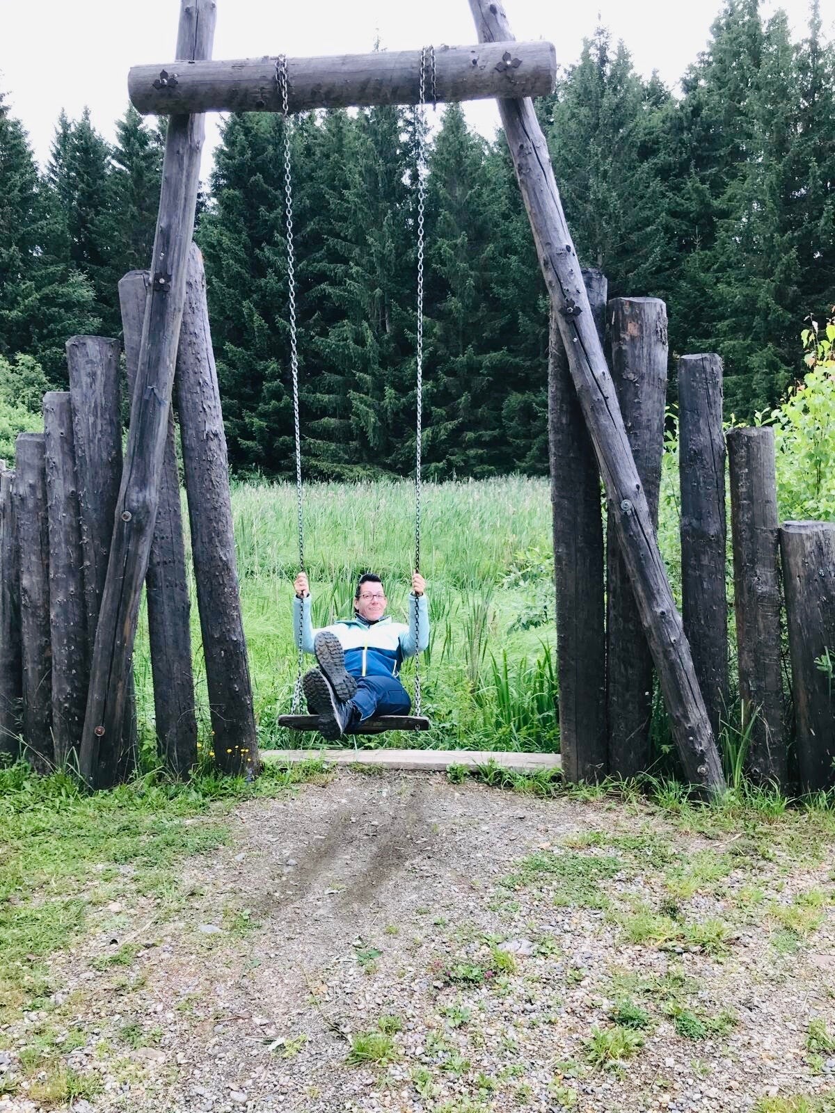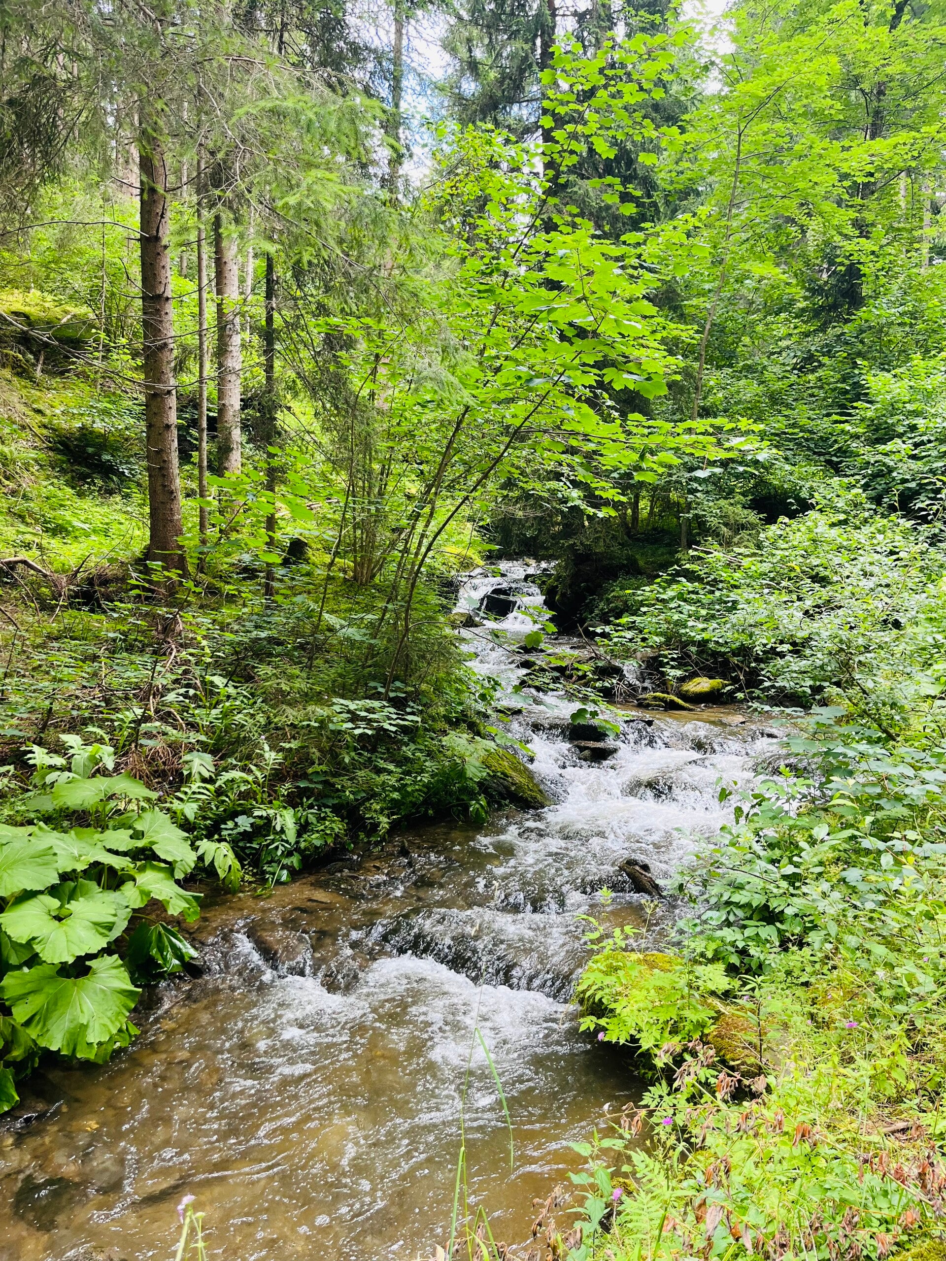 Nachdem wir Kira abgeholt haben, bleiben wir gleich im „Tal“ und durchwandern die Graggerschlucht bis zum Wasserfall und zu Zeckis Hütte. Es geht durch Wald, über Wurzeln, immer am Bach entlang. Wäre es heute etwas wärmer gewesen, dann hätten unsere Füße bestimmt ein Bad genommen. Nach genau 40 Minuten erreichen wir die Hütte, die von einem weitläufigen Spielplatz/ Motorikpark eingerahmt wird. Nach einem späten Mittagessen probieren wir ein paar Stationen aus. Das macht Spaß.