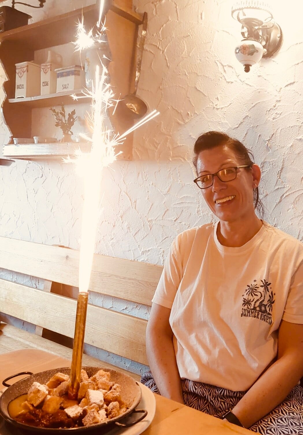 Ich kühlte meine müden Beine im kleinen Naturteich ab. Anschließend ging es zum Essen, wo mich die Wirte mit einem Liedchen und Fontäne überraschten. Mit dem Senior plauderten wir dann noch eine ganze Weile über das Leben auf seiner Alm.