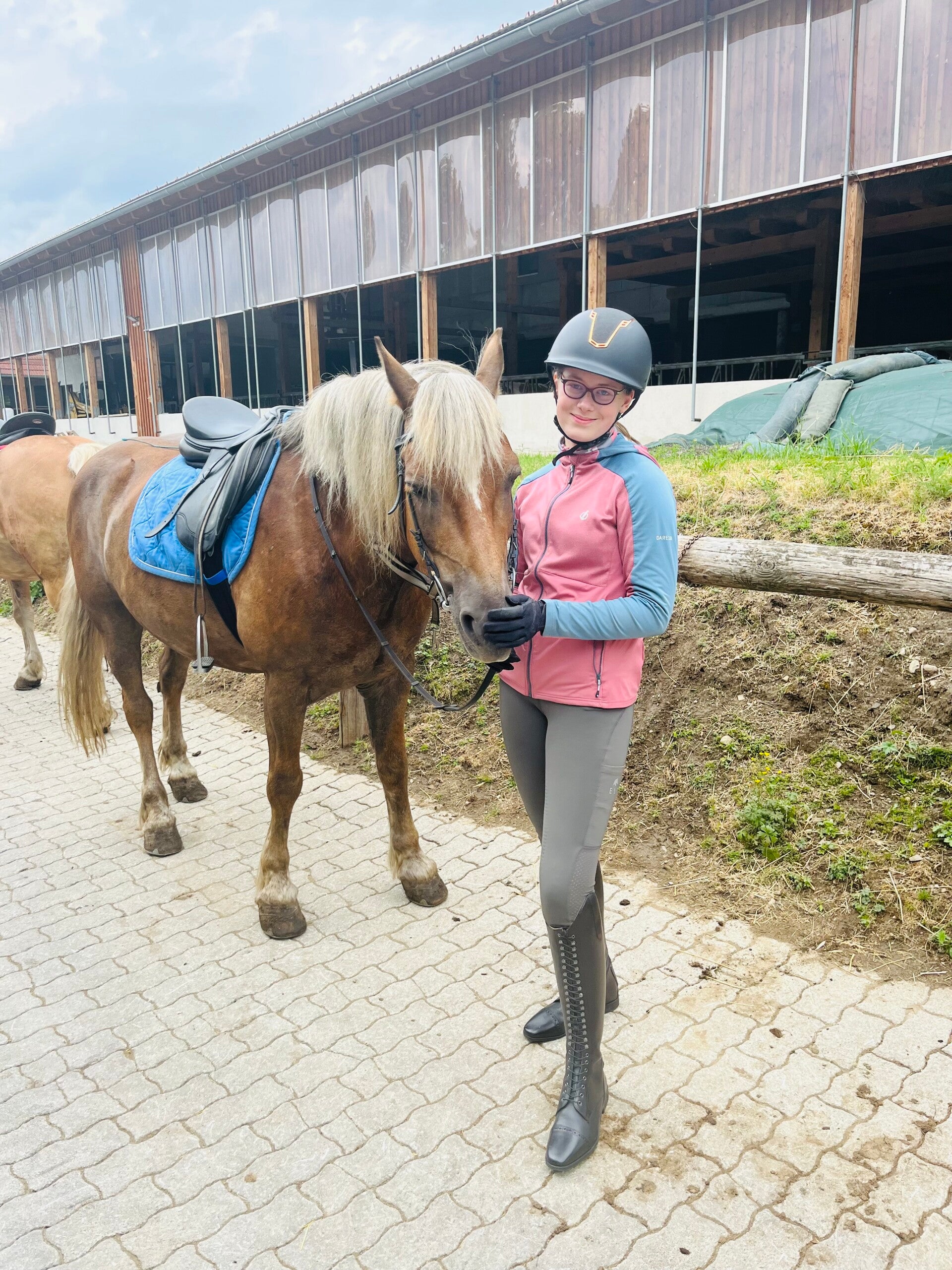Weiter ging es zum Reitbauernhof, wo Kira wieder an einen Ausritt teilnahm. Nach dem ruhigen Pferd Nandos, ritt sie heute auf dem flinken Gandal. Alles ist gutgegangen. Wir nutzten die Zeit für einen Rundgang hier in Jakobsberg. Einige junge Kühe standen am Wegesrand. Süß. Nach dem Abendessen unten in Mühlen ging es dann wieder ganz nach oben auf 1.600 m, wo erst der tierische Rundgang und später die Tischtennisrunde den Abend besiegelt.