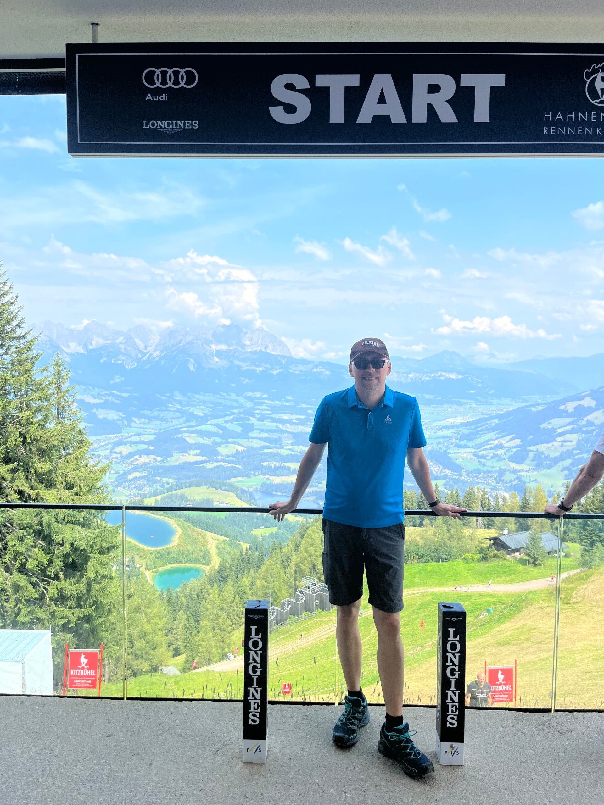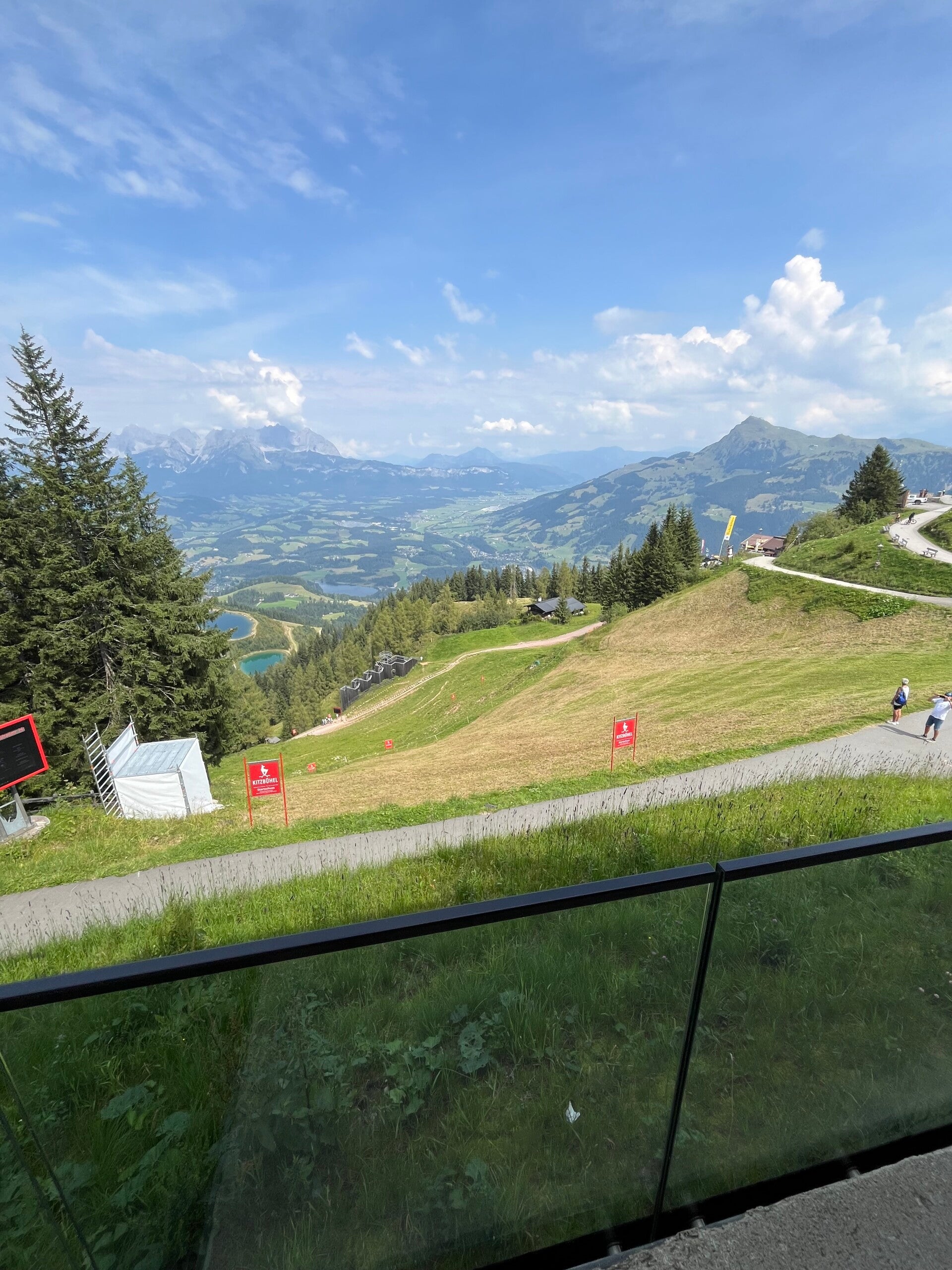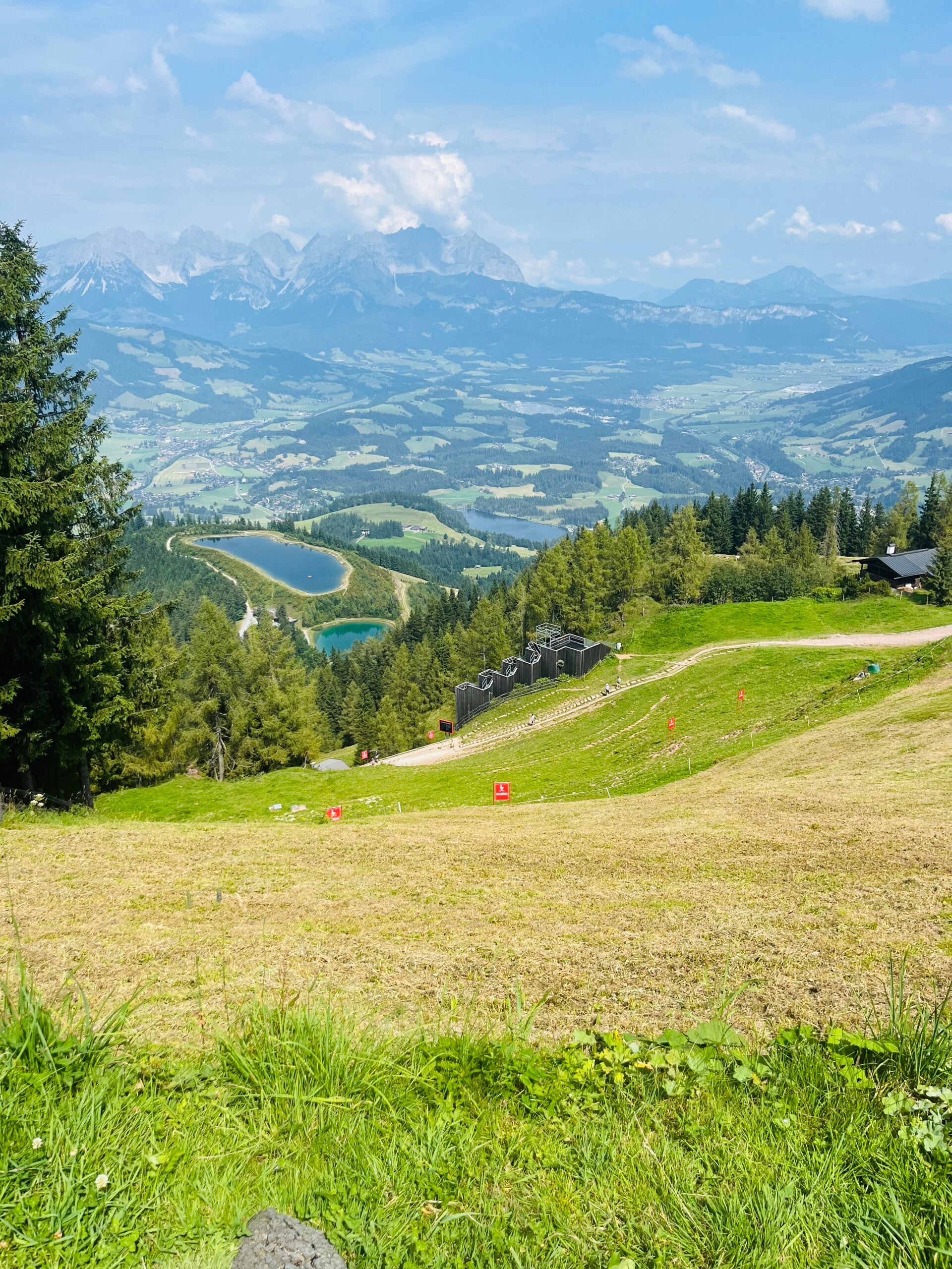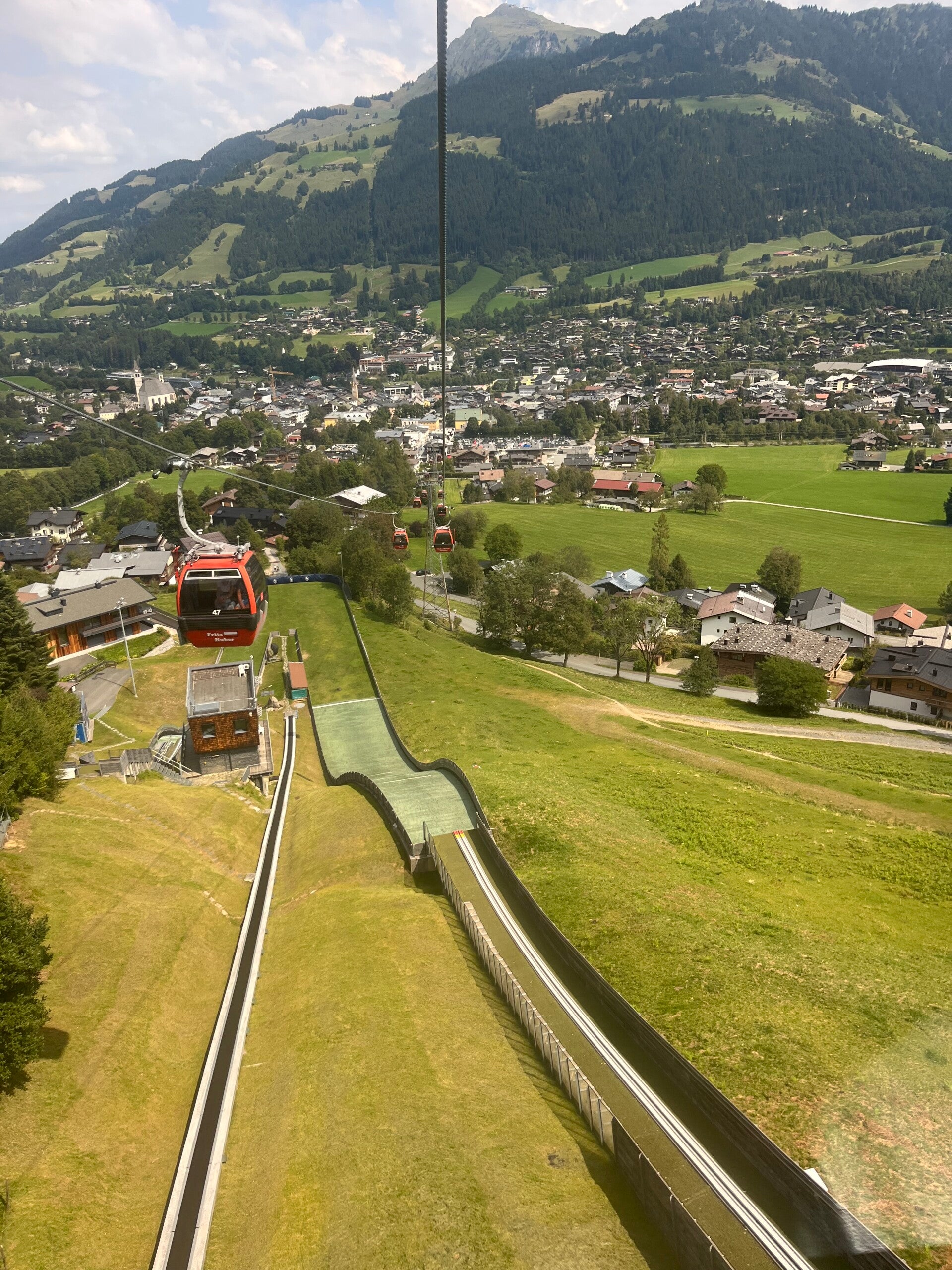 So laufen wir gemütlich zur Fleckalmbahn, nehmen die Bergbahn bis ganz oben und spazieren dann am See vorbei bis zur Bergstation der Hahnenkammbahn. Wir besichtigen das Starthaus für die Streiffabfahrt. Wahnsinn, wie steil es da nach unten geht.
