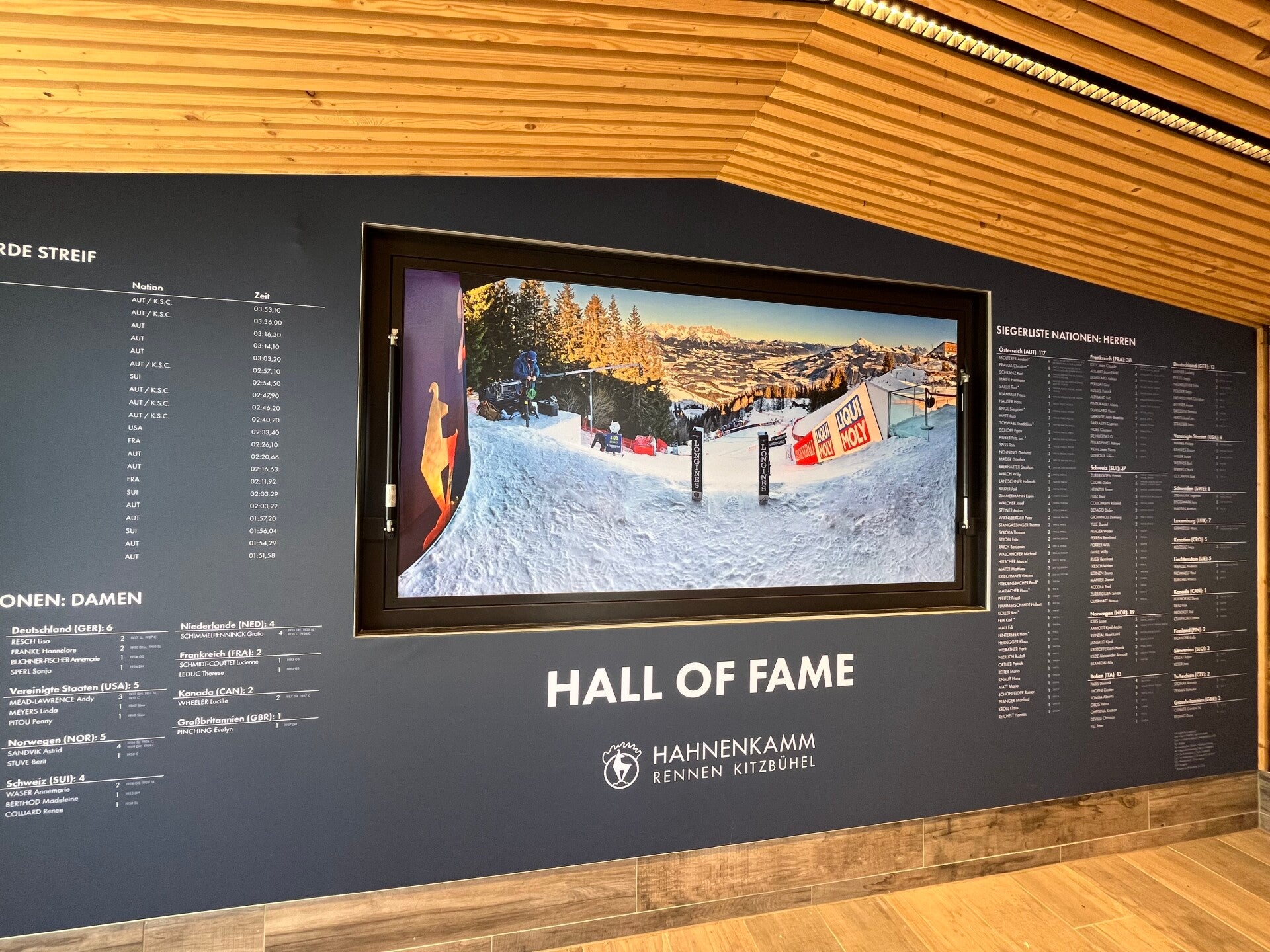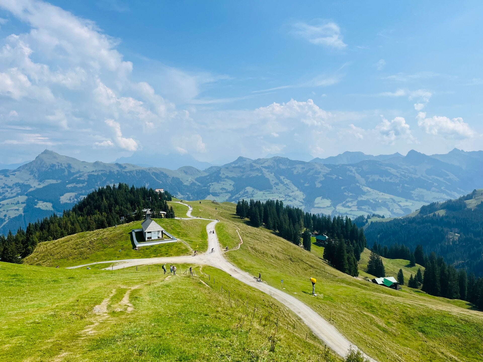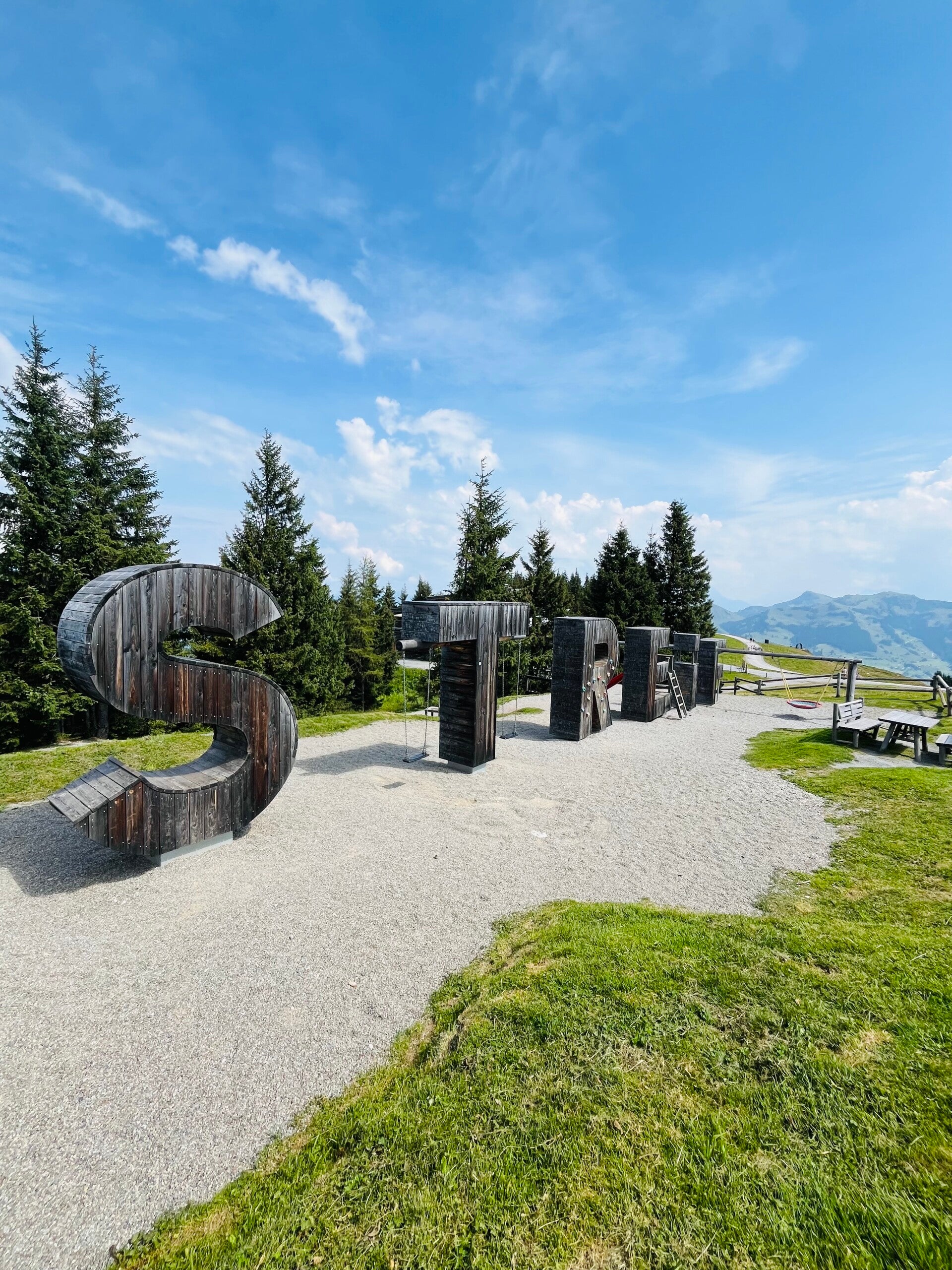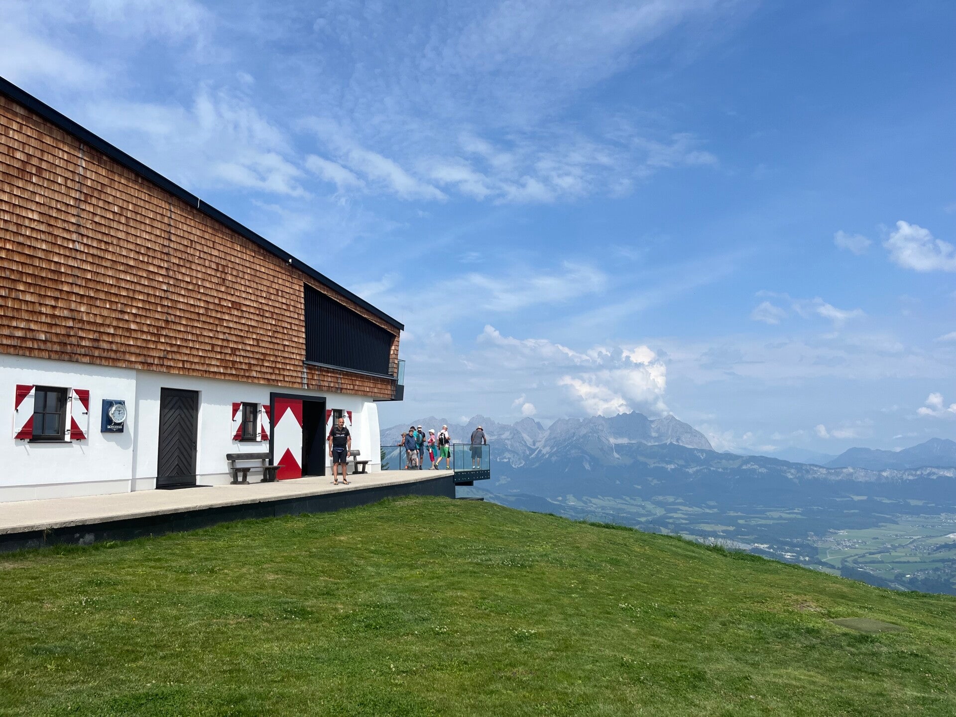 So laufen wir gemütlich zur Fleckalmbahn, nehmen die Bergbahn bis ganz oben und spazieren dann am See vorbei bis zur Bergstation der Hahnenkammbahn. Wir besichtigen das Starthaus für die Streiffabfahrt. Wahnsinn, wie steil es da nach unten geht.