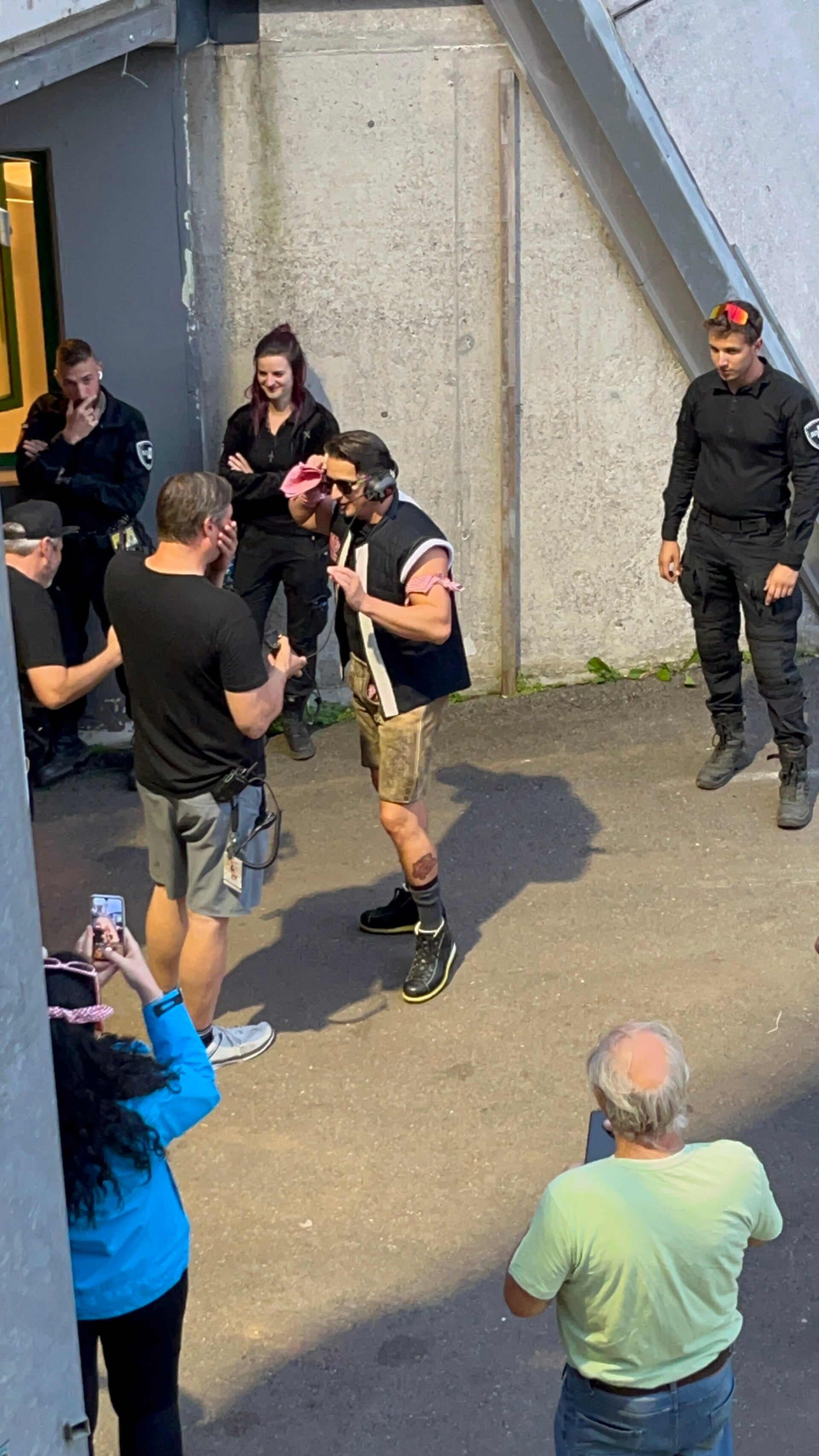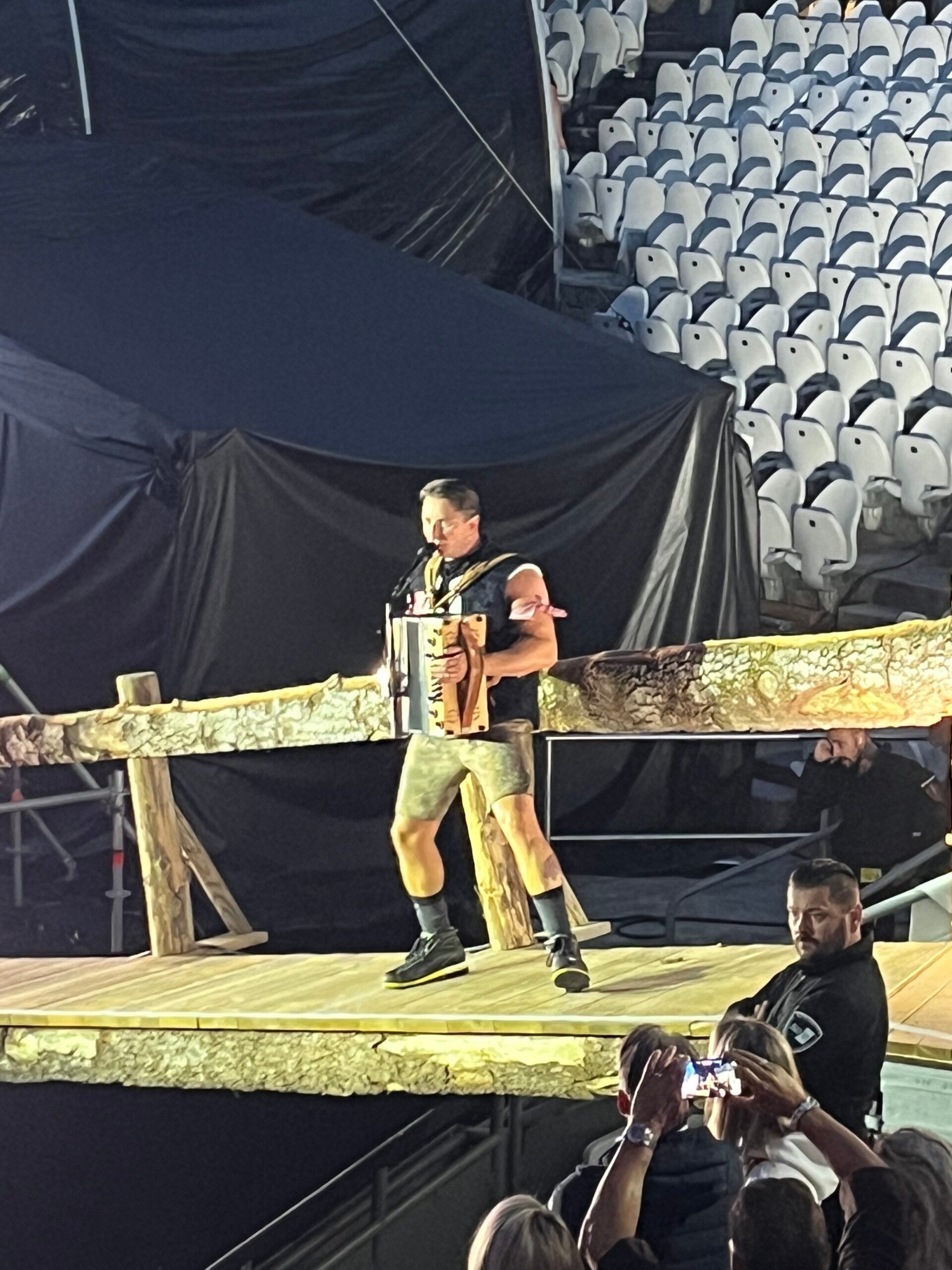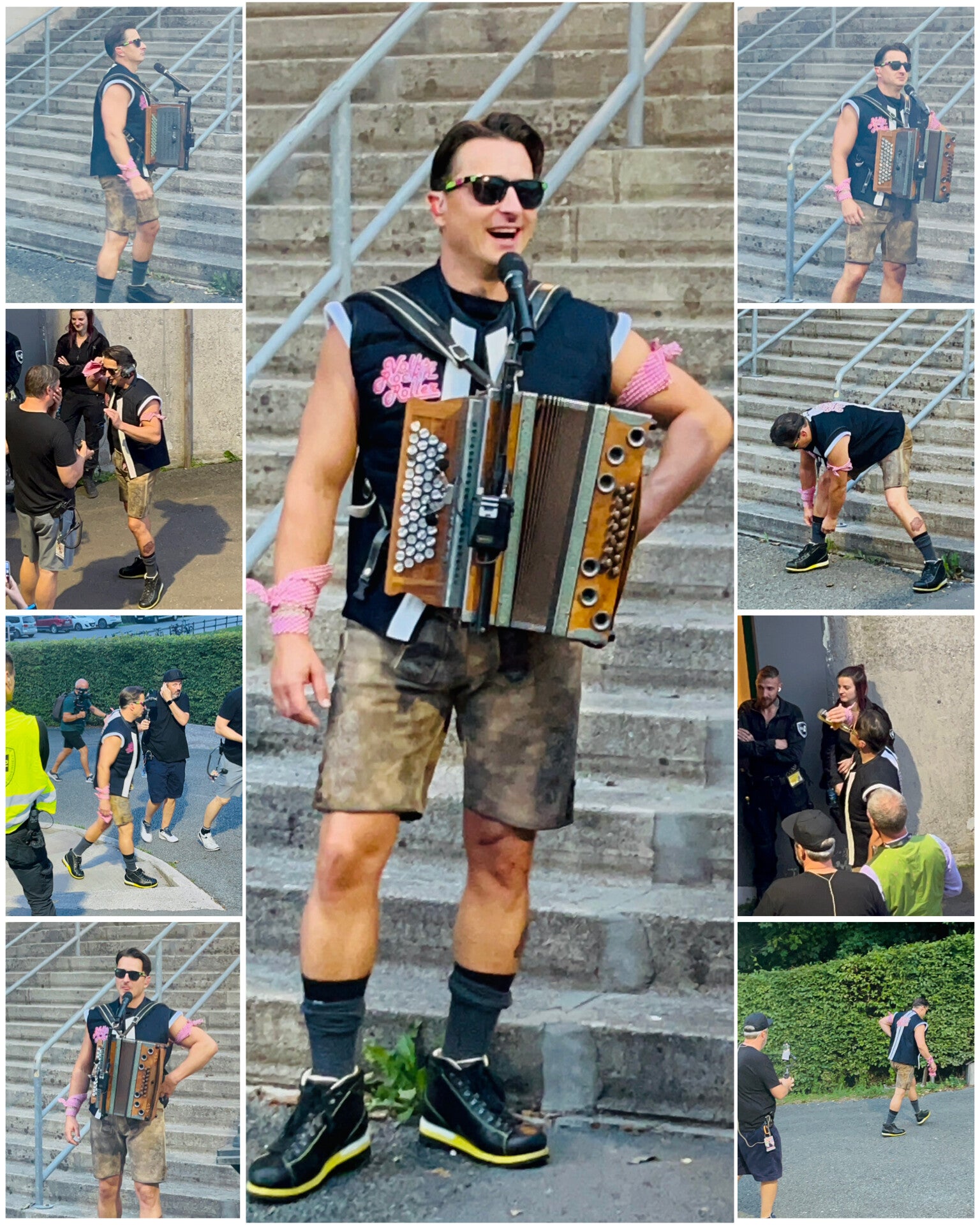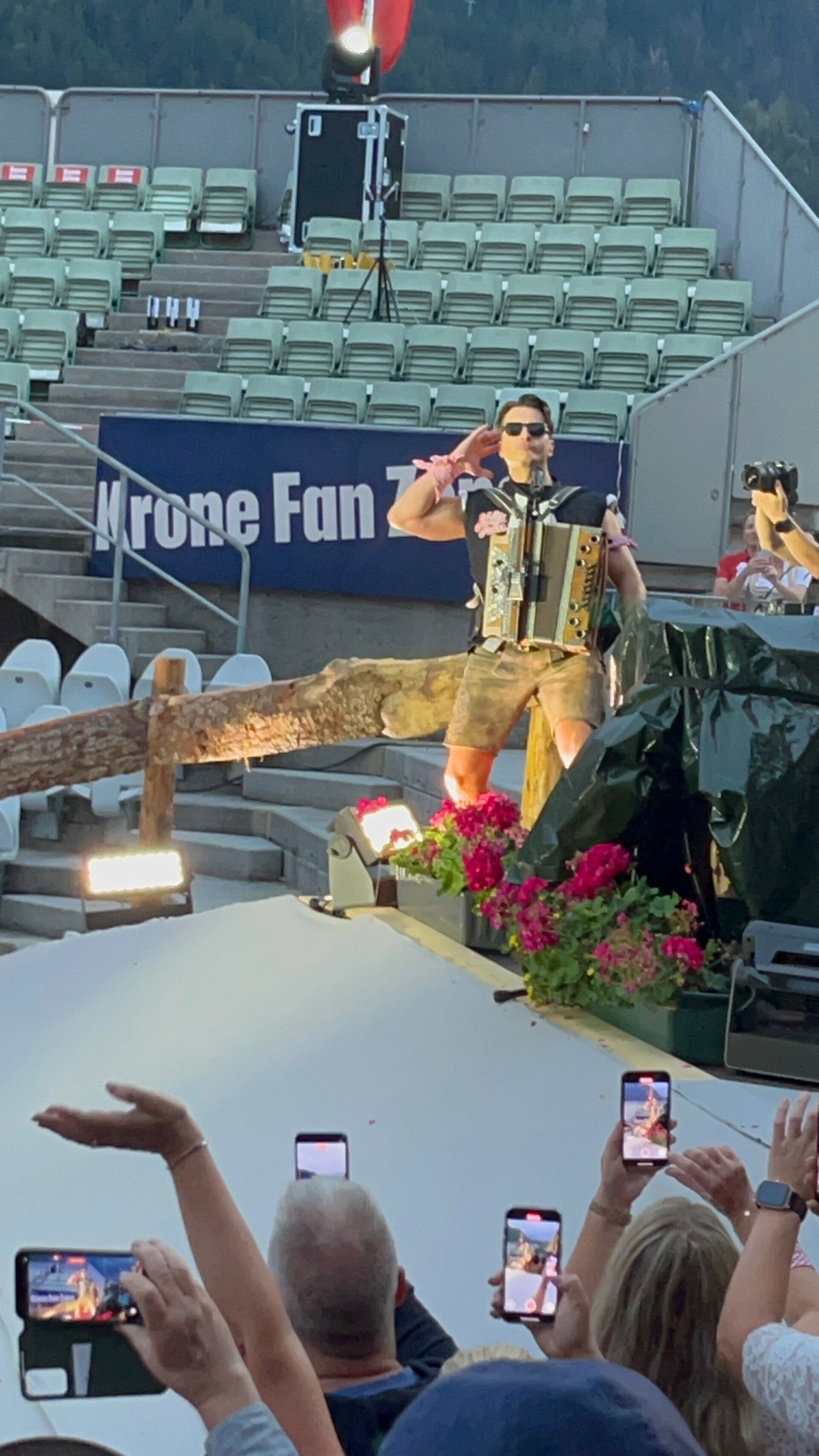 Heute ist der 2. Tag des Musikfestivals. Andi spielt sein Tourprogramm. Das Wetter scheint allen Prognosen zum Trotz trocken zu bleiben. Und so startet das Konzert für mich wie am Vortag, … hinter den Kulissen. Ganze 5 Minuten lang darf ich seinen Vorbereitungen zuschauen. Und wie locker und gut gelaunt ist er dabei ist. Dann schwinge ich mich schnell auf die Tribüne und genieße das Konzert, dessen Setlist ich langsam auswendig kenne. Weiterhin fehlen mir ein paar stimmungsgewaltige Songs um Zuckerpuppen, Heidi und aufgebügelte Dirndl. Beim letzten Lied, Amoi seg ma uns wieder, bekomme ich Gänsehaut. Das Stadion ist komplett still, als Andi mit zittriger Stimme und Tränen in den Augen dieses Lied versucht zu singen. Als die Stimme ganz versagt steigt das Publikum ganz leise textsicher ein. Das sind Momente die definitiv bleiben.