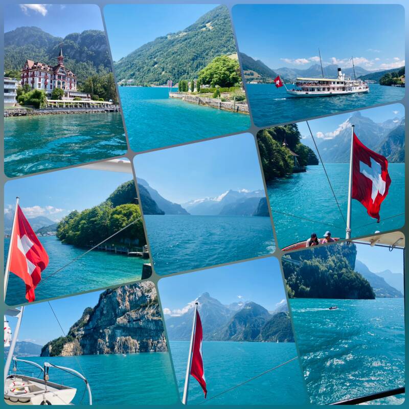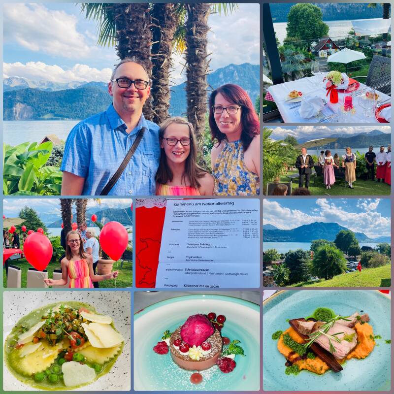 Mit dem Schiff gehts direkt von der Anlegestelle Luzern Lido bis nach Weggis. Dort lassen wir den Tag erst ruhig am Pool und später bei einem leckeren Gala-Dinner ausklingen. Auch hier ist heute alles fein hergerichtet. Die Gastgeber geben einen kleinen Sekt-Empfang. Um 22 Uhr wird der Tag mit einem Feuerwerk kurz vor einem ordentlichen Gewitter besiegelt.