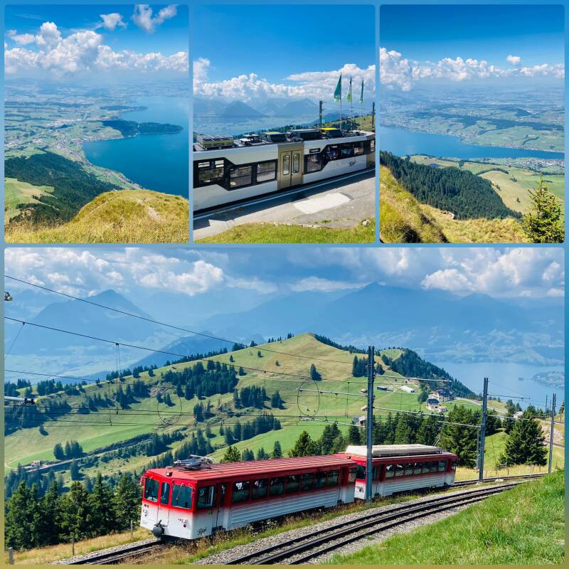 Aufgrund einer Baustelle kommt der Bus nach Vitznau tatsächlich leicht verspätet. Unseren Anschluss, die Zahnradbahn, schaffen wir trotzdem locker. Es soll hoch auf die Rigi - die Königin der Berge (Rigi Kulm 1.797 m) gehen. Diese Idee haben wohl auch viele andere Menschen an diesem Tag. Als auch noch das Schiff anlegt wird es noch voller. Die Bahn ist ganz neu und modern, obwohl die Strecke schon seit 1871 als erste Bergbahn Europas bedient wird. Nun gut. Irgendwann bewegt sich der Waggon nach oben in Richtung Berg und wir erreichen die Rigi, von der man einen wunderbaren Rundumblick genießen kann.