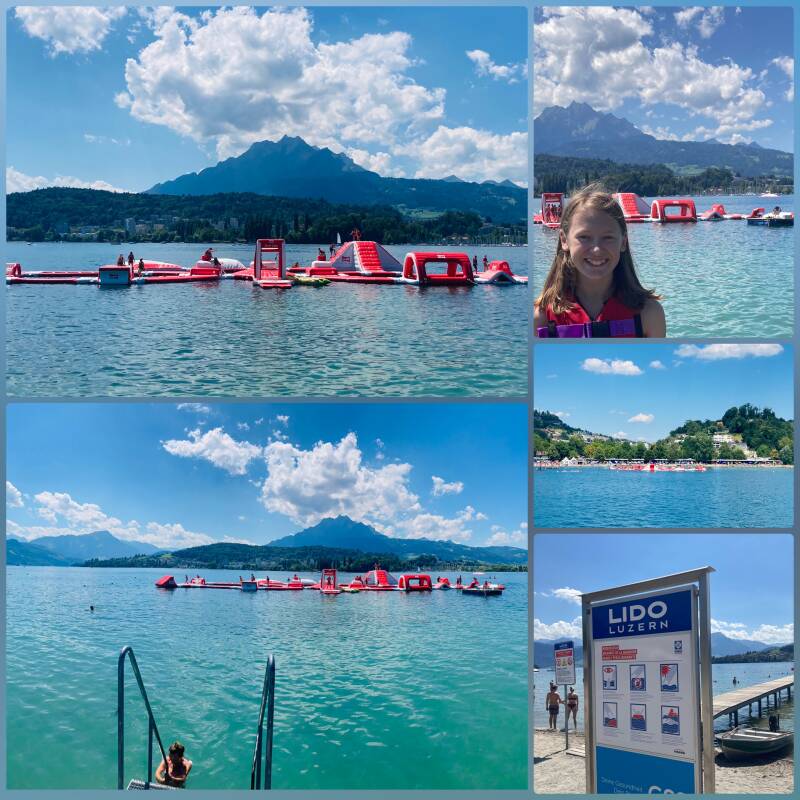 Eigentlich wollen wir einen Chilltag am See einlegen, aber unser Teenager hatte einen Wasser-Splash-Park in Luzern während der gestrigen Schiffffahrt entdeckt und so machen wir uns mit dem Bus auf ins Lido von Luzern. Online wird schnell eines der letzten Tickets für die Hüpfburgen erworben und schon liegen wir im Gras des Luzerner Freibades. Alles ist schön angelegt. Es gibt genügend Platz zu den Nachbarn. Es wird eine ganze Stunde lang gehüpft, getaucht und gerutscht. Keine Minute wird verschenkt.