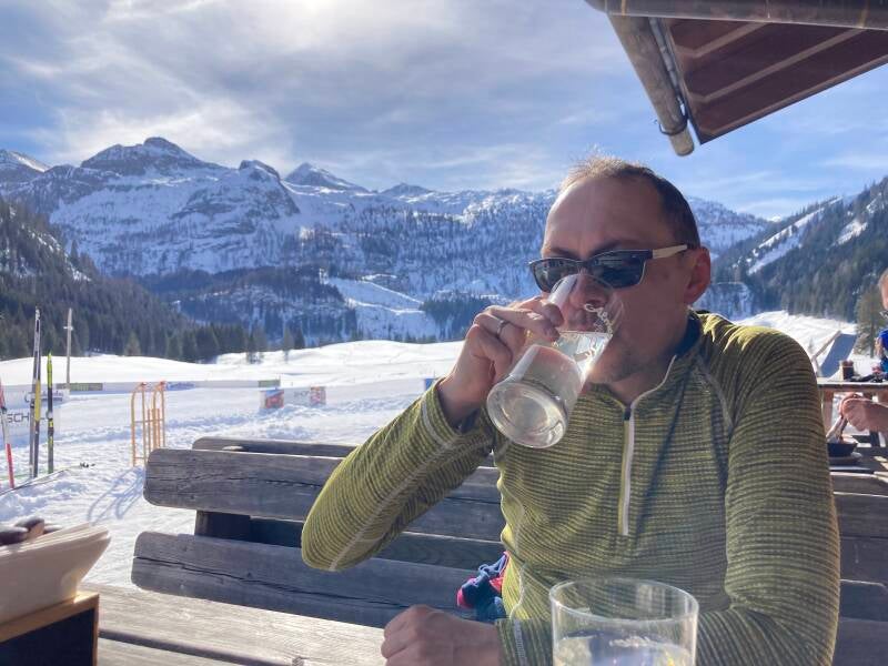 Nach etwas Stau kommen wir schließlich im Winterparadies an. Wir bekommen wie immer unser Eckzimmer Nummer 25. Kira ist direkt im Stall verschwunden und wir Erwachsenen trinken erstmal was Schönes an der Bar.
