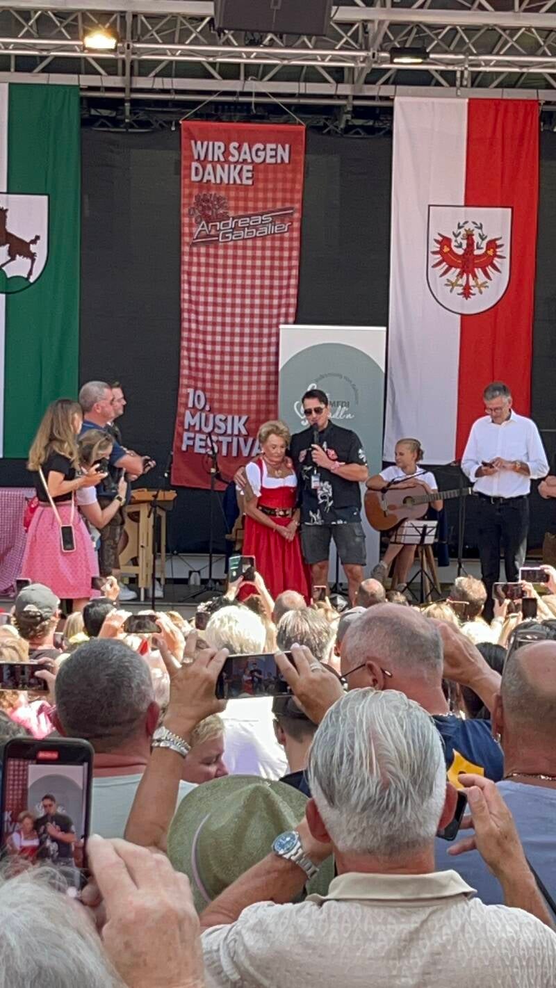 Heute frühstücken wir ganz entspannt. Anschließend machen wir uns auf in Richtung Kitzbühel, wo um 11:45 Uhr Andreas Gabalier auf der Bühne in der Vorderstadt in den sozialen Netzwerken angekündigt ist. Wir parken kostenfrei auf dem Parkplatz Pfarrau und laufen gar nicht lang bis in die Innenstadt. Vorbei an der Kirche und der Reisch-Bar Bühne erreichen wir unser Ziel. Noch gut 1 h und die besten Plätze direkt hinter der Absperrung sind bereits belegt. Wir setzen uns in ein Café direkt daneben und beobachten die Dinge. Irgendwann geselle ich mich an die Absperrung hinter ein paar kleinen Damen, wo ich gut darüber schauen kann. Kurz vor 12 Uhr führt dann die Kitzbüheler Blaskapelle den Konvoi an. Andi sitzt hinten auf der Rücksichtsbank eines Oldtimers und genießt den Jubel der zumeist weiblichen Zuschauer. Schließlich kommt er auf die Bühne, unterhält wie immer gut das Publikum. Es gibt eine Auszeichnung der Stadt Kitzbühel für 10 Jahre Musikfestival und zahlreiche Geschenke. Die wird er mit Sicherheit nicht annehmen, da er außer einer Flasche Wein, die dann gemeinsam getrunken wird, prinzipiell keine Geschenke möchte. Das scheint sich noch nicht bis nach Tirol herumgesprochen zu haben 🤣.