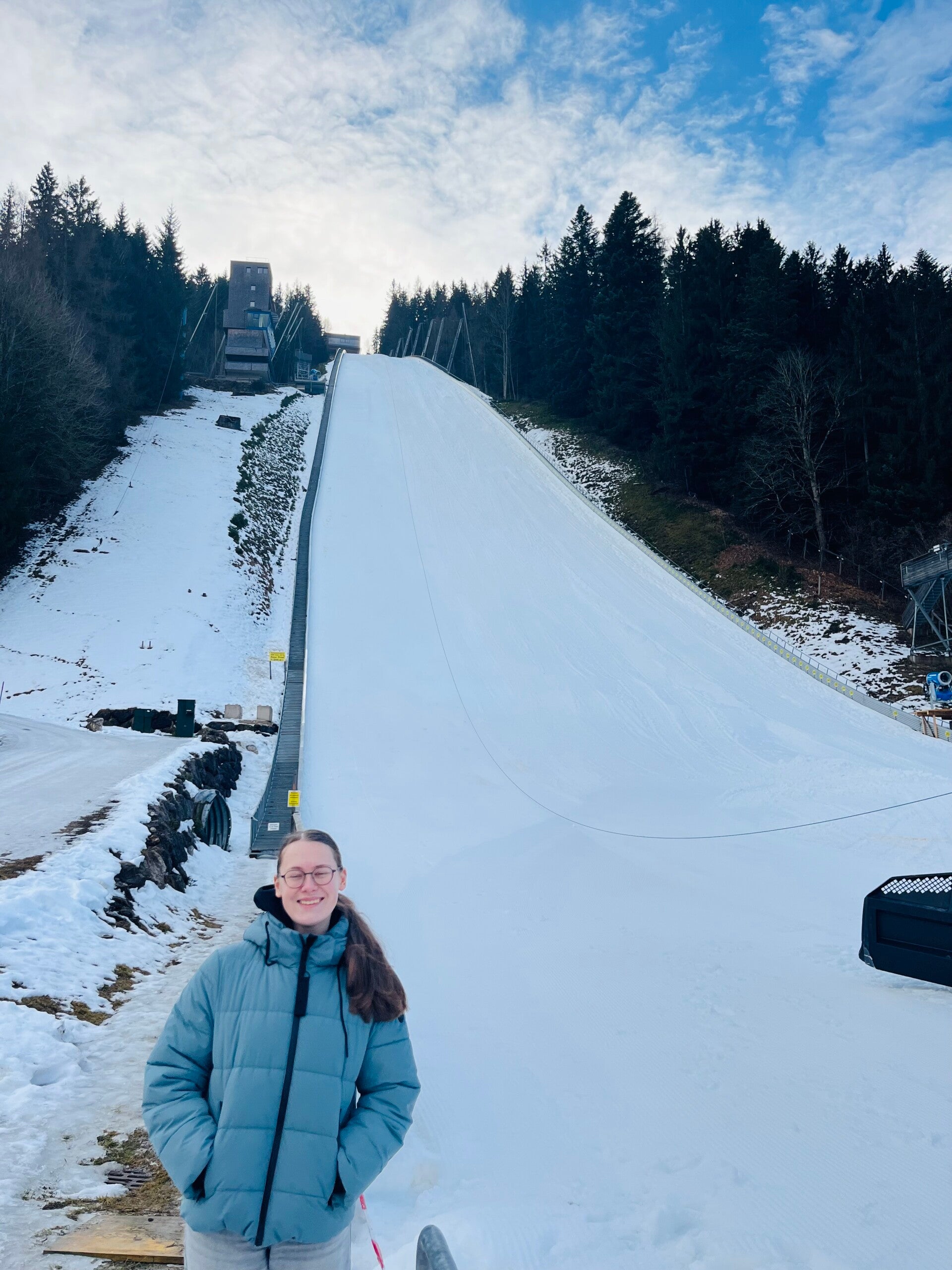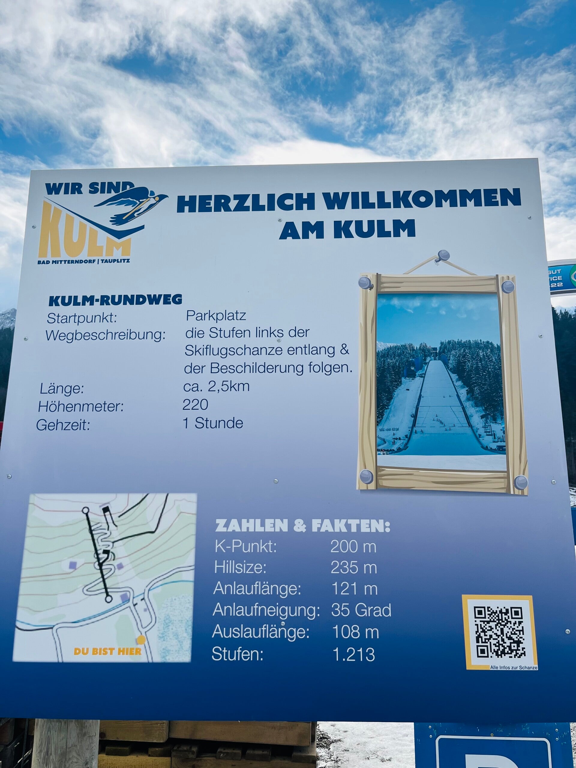 Am nächsten Morgen genießen wir ein kleines, aber feines Frühstück. Die Koffer sind wieder im Auto, die Skiklamotten liegen bereit. Spontan legen wir einen Halt in Bad Mitterndorf ein, wo die Skiflugschanze „Kulm“ liegt. Ende März findet hier ein Weltcup im Skifliegen und der Nordischen Kombination statt. Bis zu 90.000 Zuschauer passen hier herein. Heute sind es nur die drei Tischlers, wir sind allein.