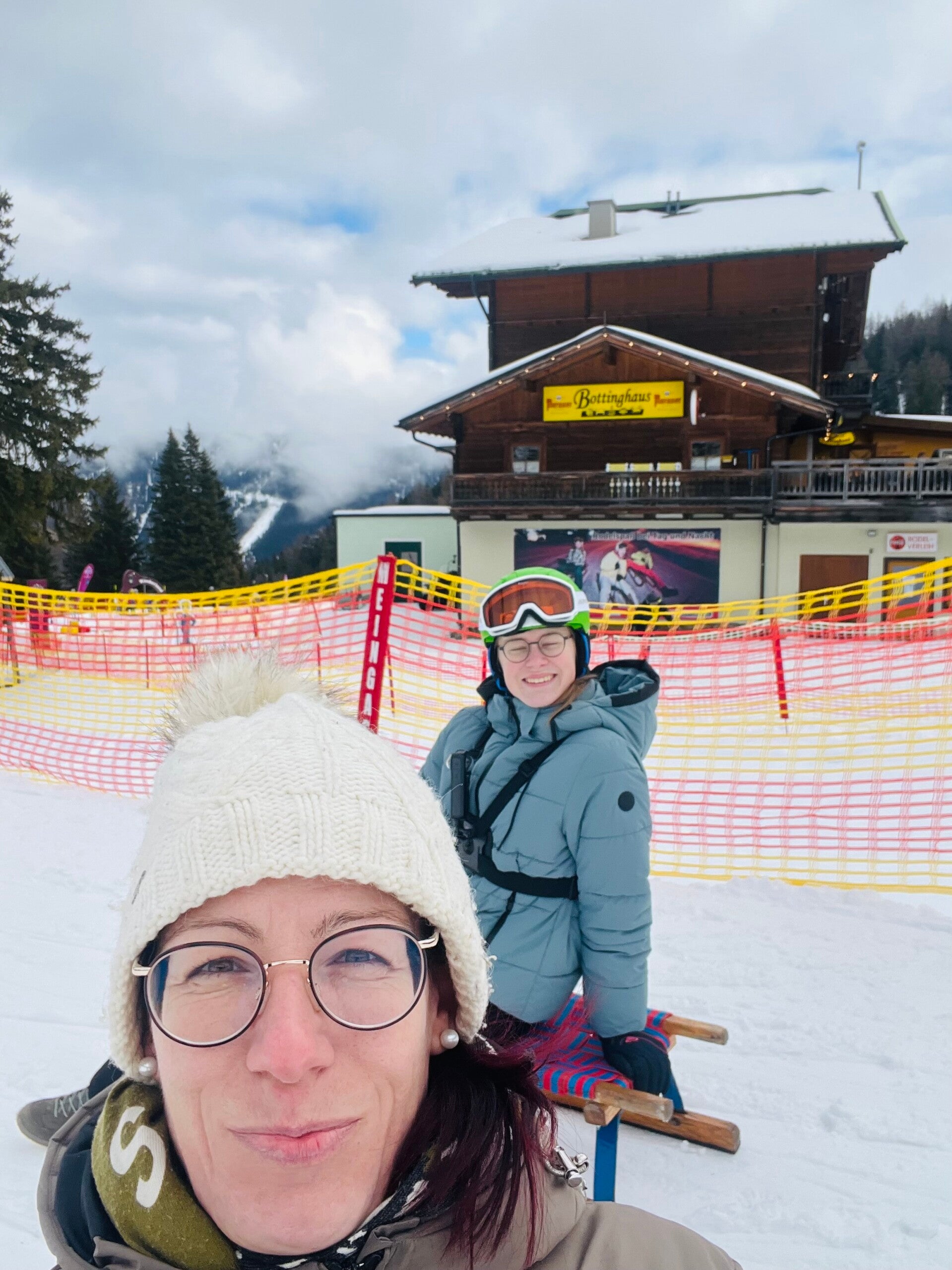 Weiter geht’s in Richtung Schladming, zum Rodeln. Die 5 km Auffahrt hoch zum Galsterberg schmeckt nicht allen Familienmitgliedern. Die Straße ist zwar gut steigend, aber asphaltiert und eisfrei. Die Rodel werden ausgeliehen und schon sitzen wir in der Gondelbahn, die uns bis auf über 1.600 m bringt. Wir sind anfangs allein auf der Rodelstrecke, die ganz flach und bestens präpariert ist. Eine tolle Strecke. 4 km. Erst am Ende ist der Schnee schon sehr aufgeweicht. Aber das hat richtig Spaß gemacht. Und das Knie von Kira hat super mitgespielt.